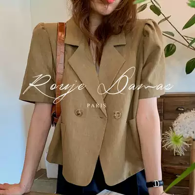 French Rouje Damas niche retro lapel two double breasted loose bubble sleeve short cotton suit women