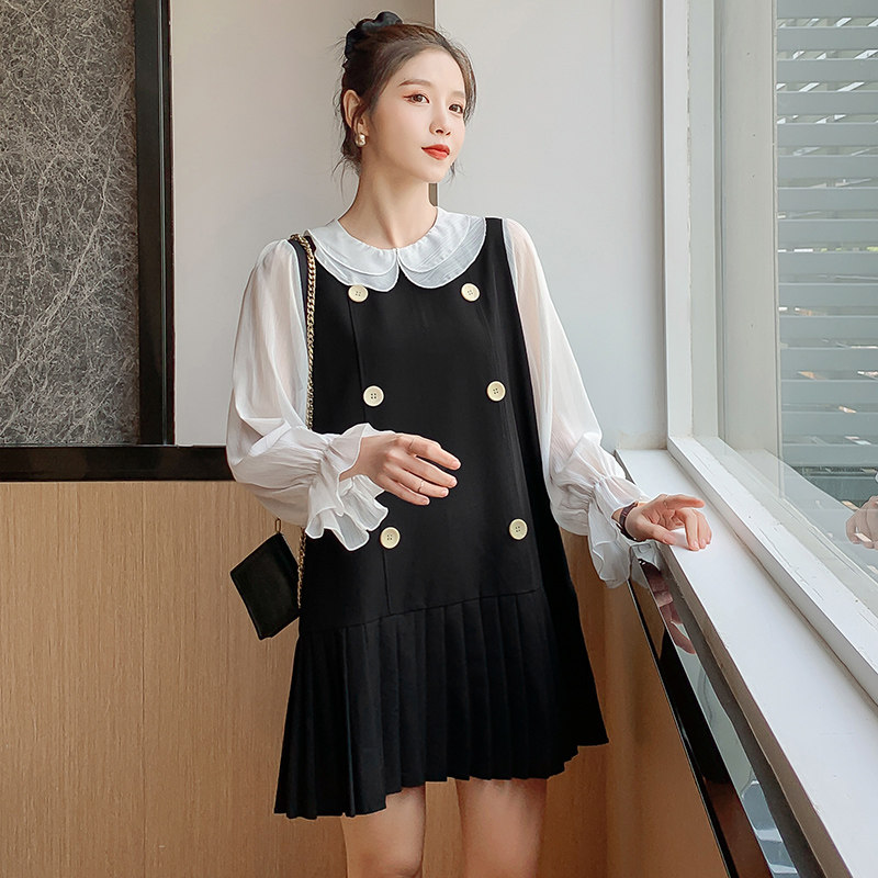 Maternity dress 2021 autumn new small loose and thin doll collar fake two sweet pleated skirts