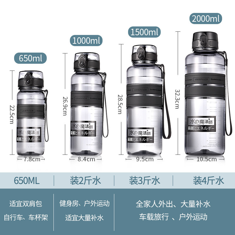 Sports water cup large capacity male fitness kettle outdoor 2000ml large cup 1500ml portable 1000ml water bottle