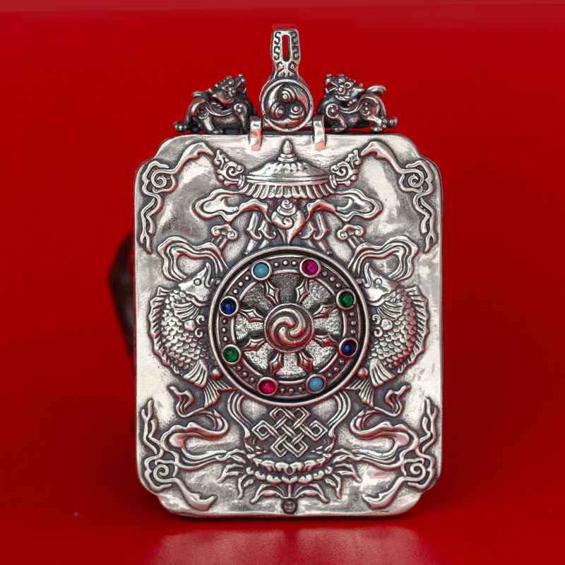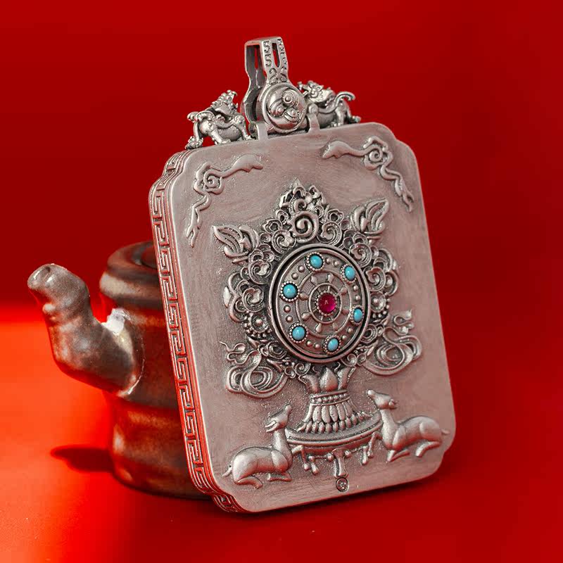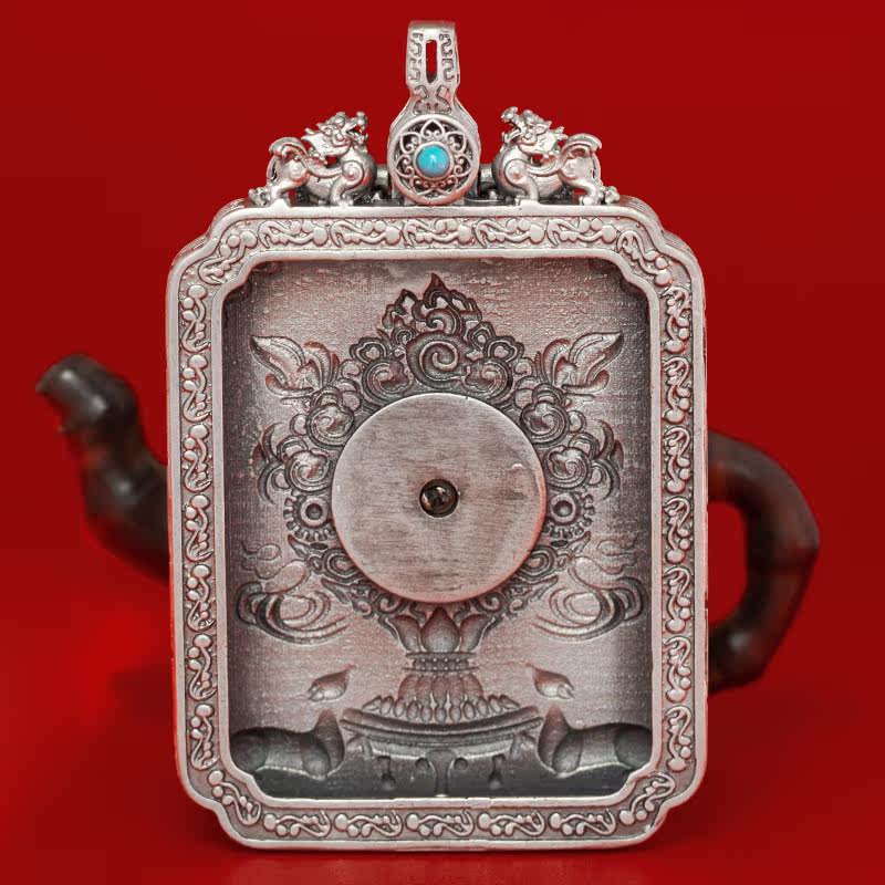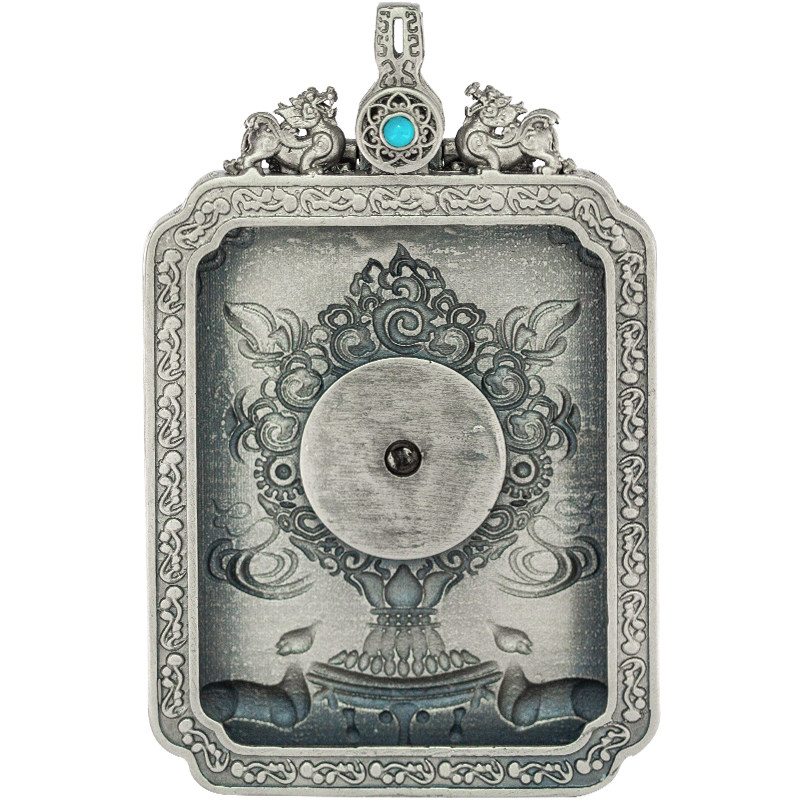 The back of sterling silver Tang card box with hand-painted thangka pendant amulet can be turned on