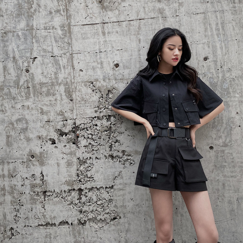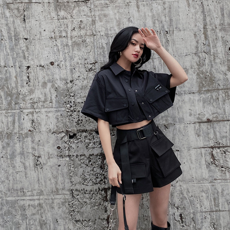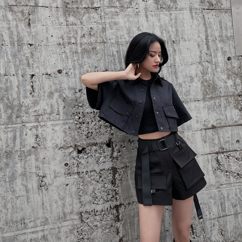 Black universe tooling jacket women's trendy brand thin short-sleeved shirt hot trendy loose and lazy wind small top