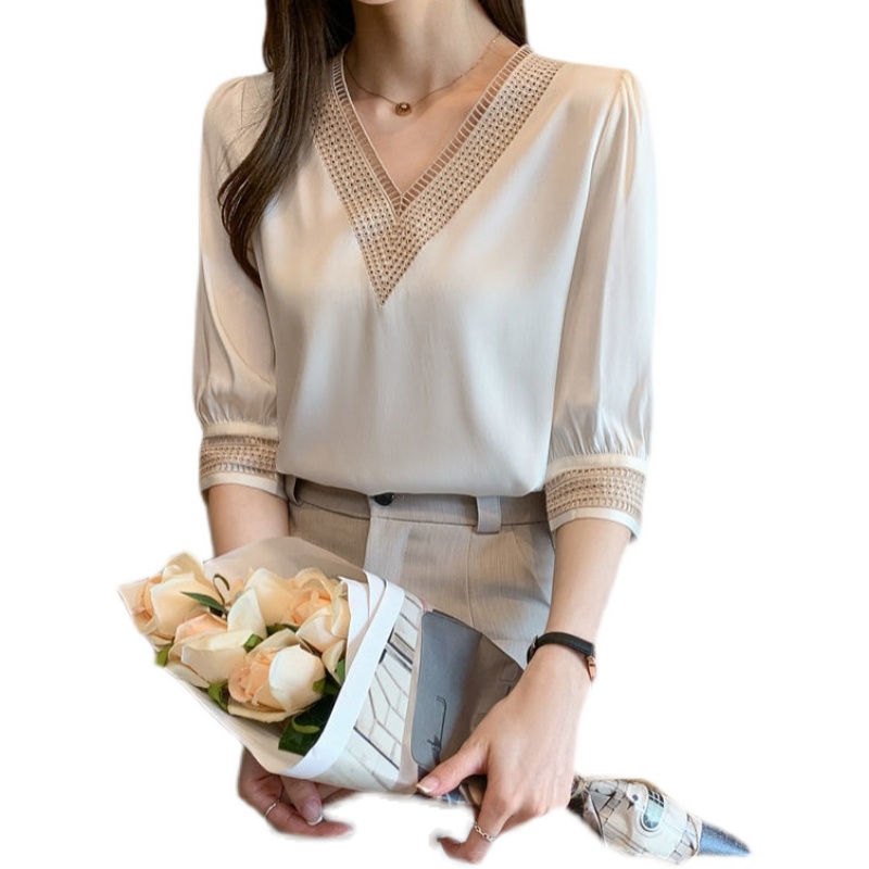 Gu Qiqi GUQIQI white V-neck high-end chiffon shirt 2021 summer new light mature age-reducing simple short-sleeved top