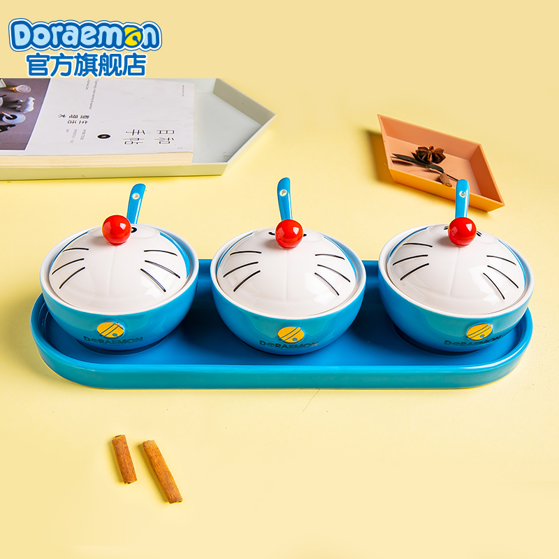 Aimovie Authorized Doraemon Dream Kitchen Supplies Cute sauce with lid with spoon Spoon Seasoning Cups Ceramic Jars 3 Clothes