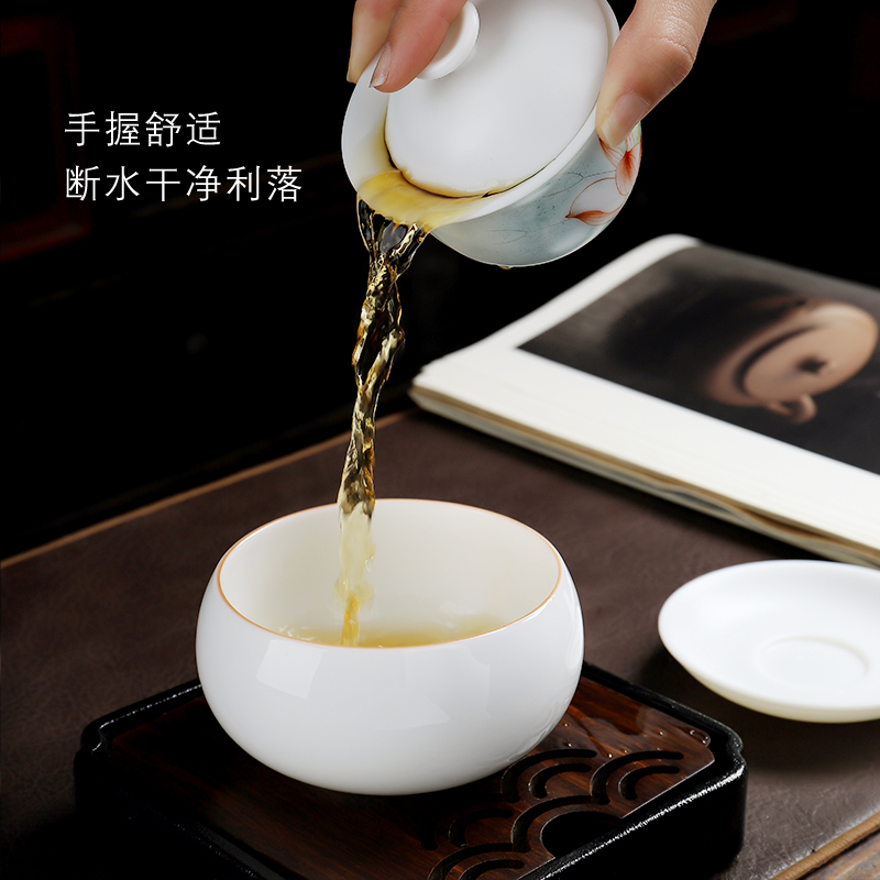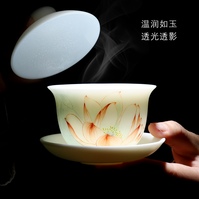 Miaolian Tianxiang Dehua Suet Jade White Porcelain Sancai Covered Bowl Single Hand-painted Undyed Clear Lotus Teacup Bowl High-grade