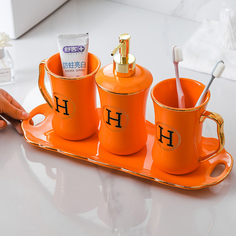 Nordic bathroom light luxury ceramic wash cup couple mouthwash cup simple cup creative brushing cup five-piece handle