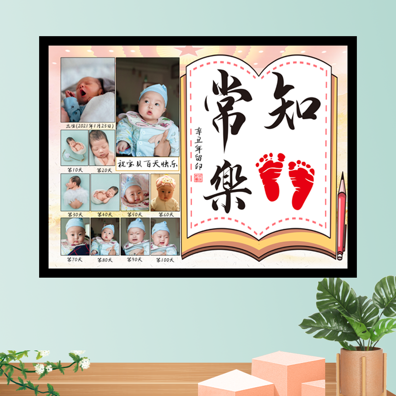 Baby 100-year-old figure little feet 100-day hand and foot print commemorative photo frame calligraphy and painting Newborn full moon year-old gift customization