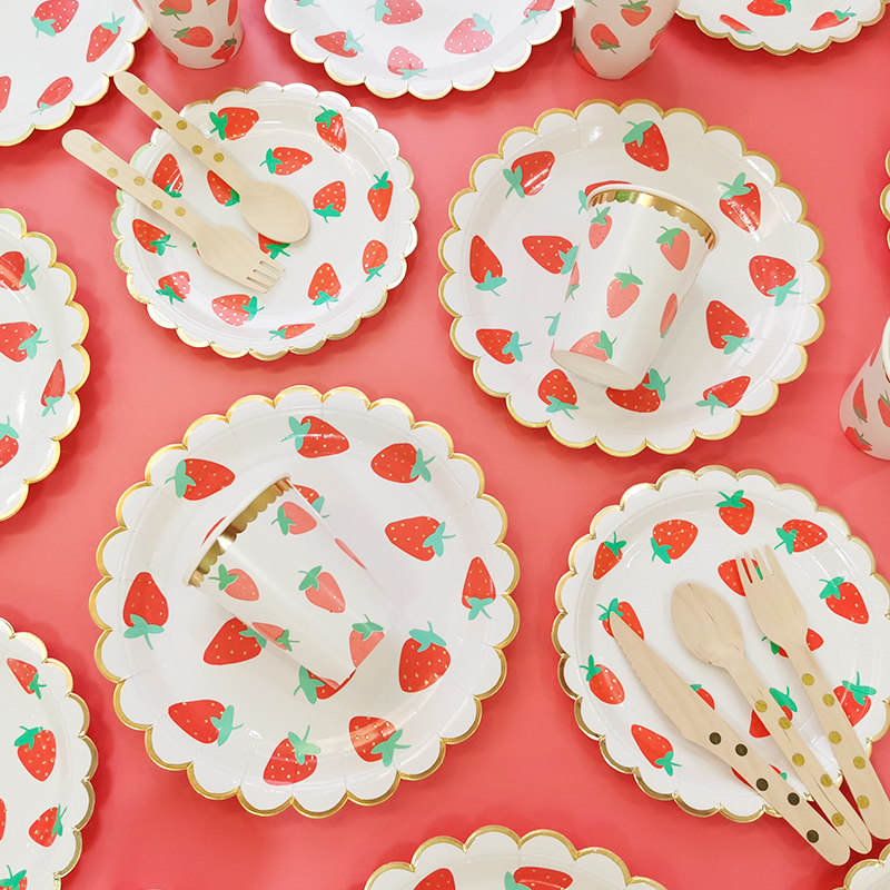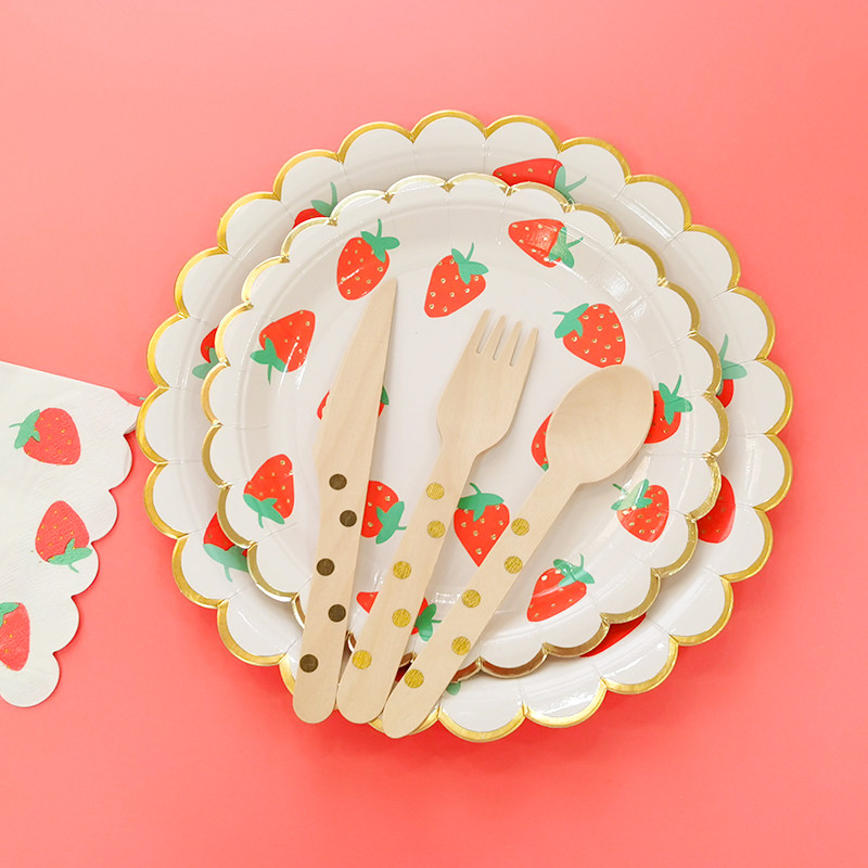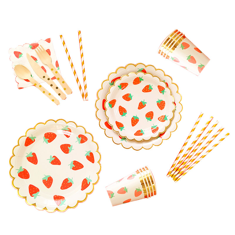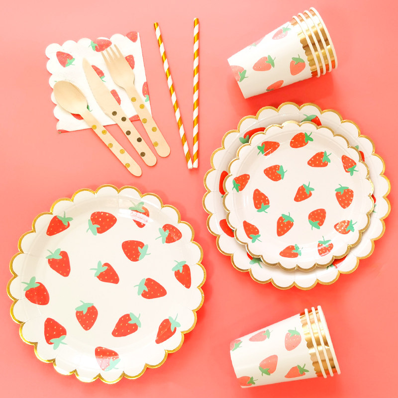7 inch strawberry plate 8 9 inch strawberry paper plate 8 strawberry napkins 16 strawberry cups 8 wooden forks 8 wooden knives 8 wooden spoons 8 wooden spoons 8 stamping straws 10