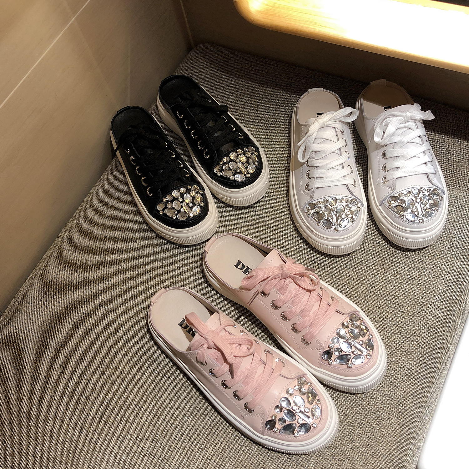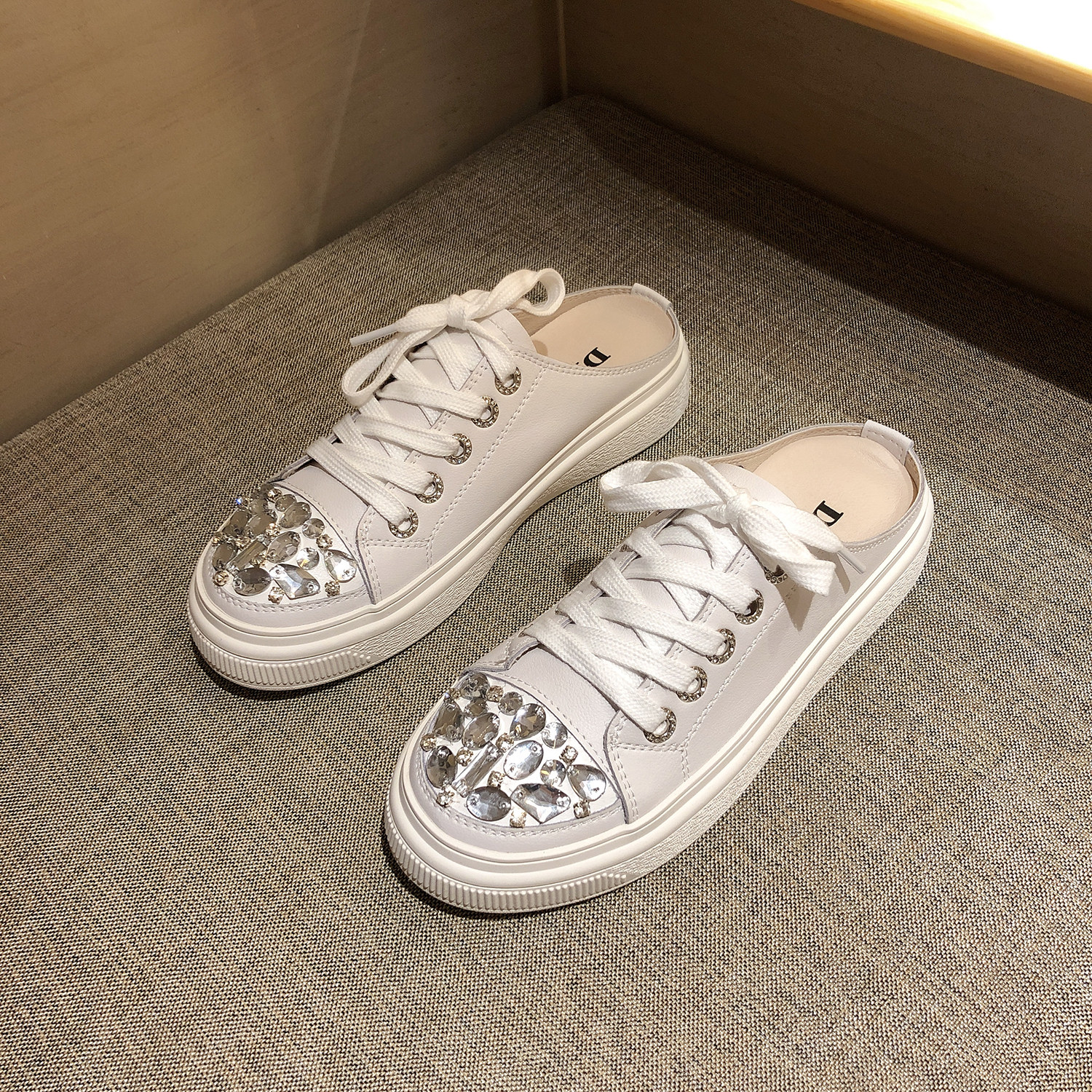 Baotou half slippers women fashionably wear the new water drill lazy breathable leather woman shoes thick tide drag in 2023
