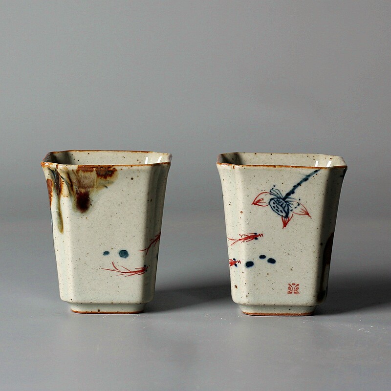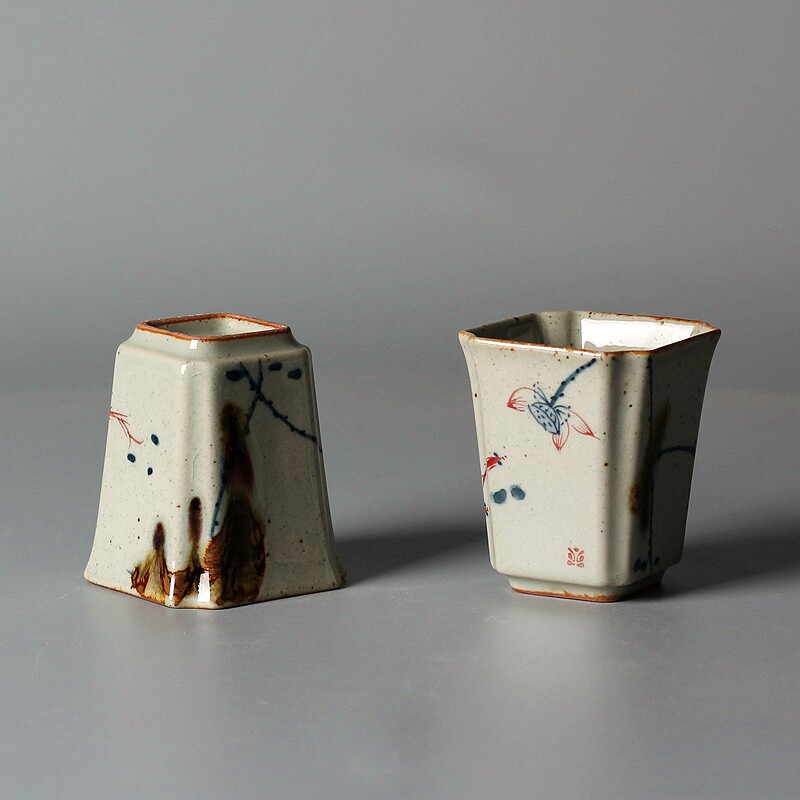Lin Sunset Ancient Pottery Glazed Red Tasting Cups Hand-painted Coarse Pottery Small Cups Quadrilateral Hand Painted Green Flowers Tea Bowls Polyincense Cups-Taobao