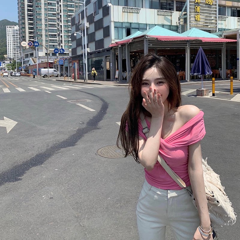 DoggyQin Cosmic Sweetheart 2021 summer new one-shoulder hollow mesh short-sleeved women's embroidered knitted top