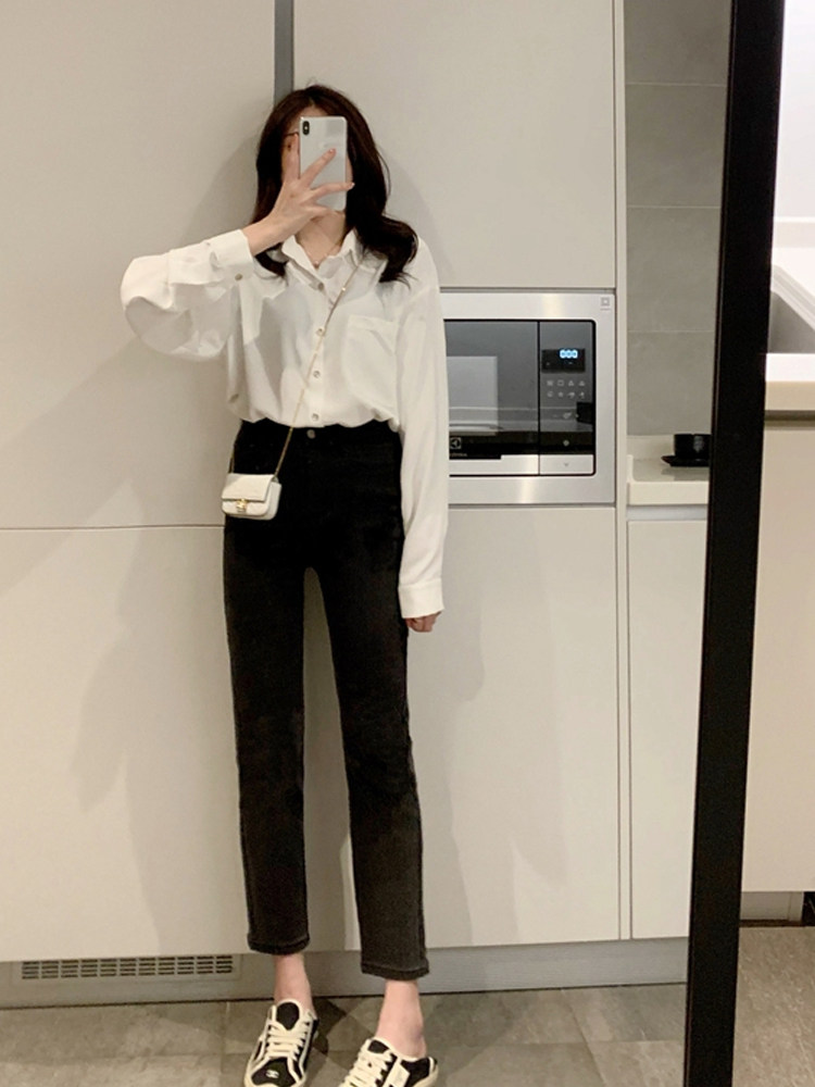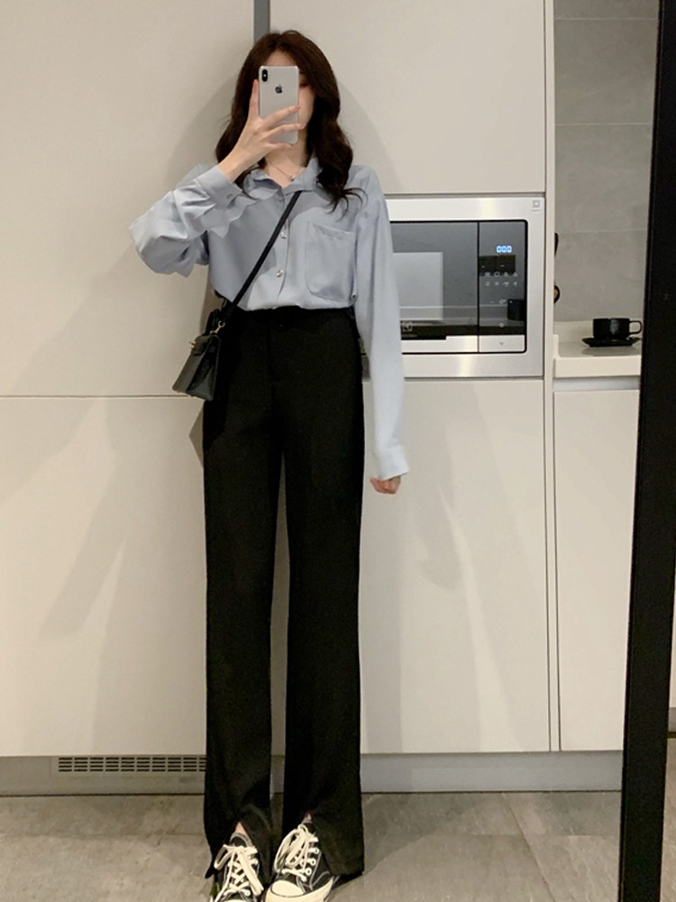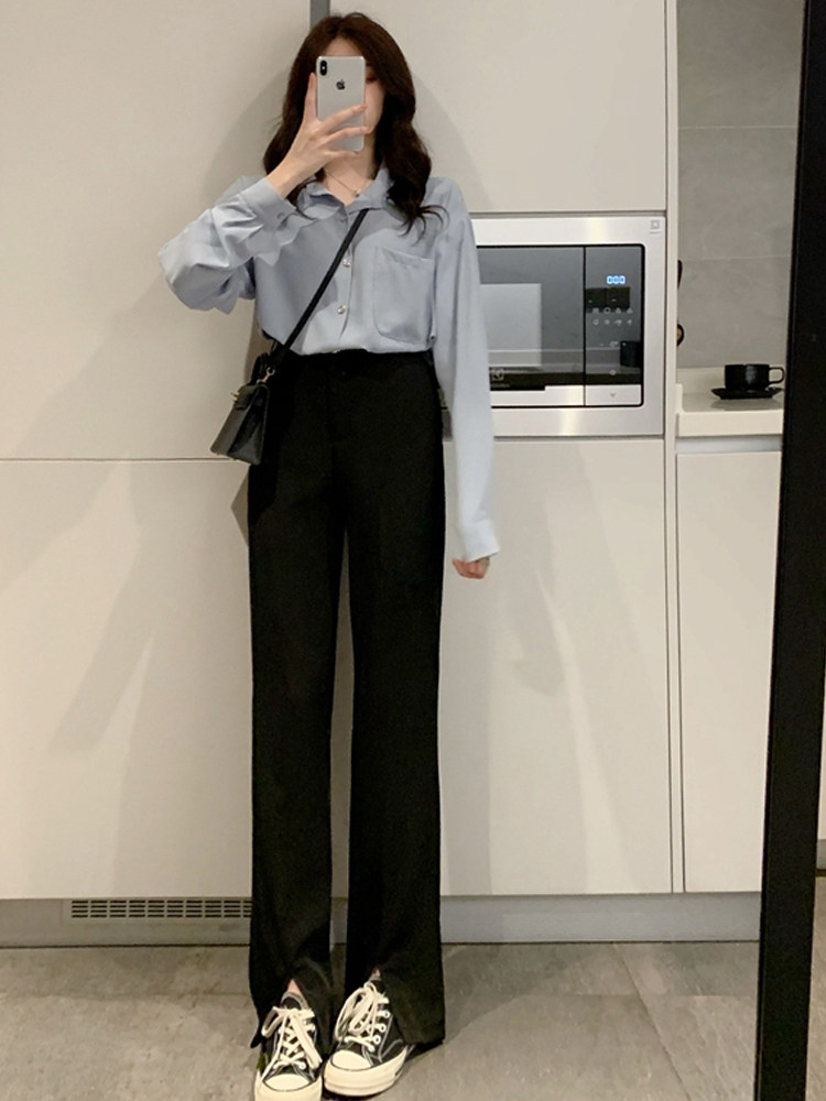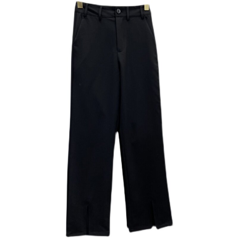 Suit pants women's spring and summer black split loose wide leg pants Button straight high waist hanging split mopping pants