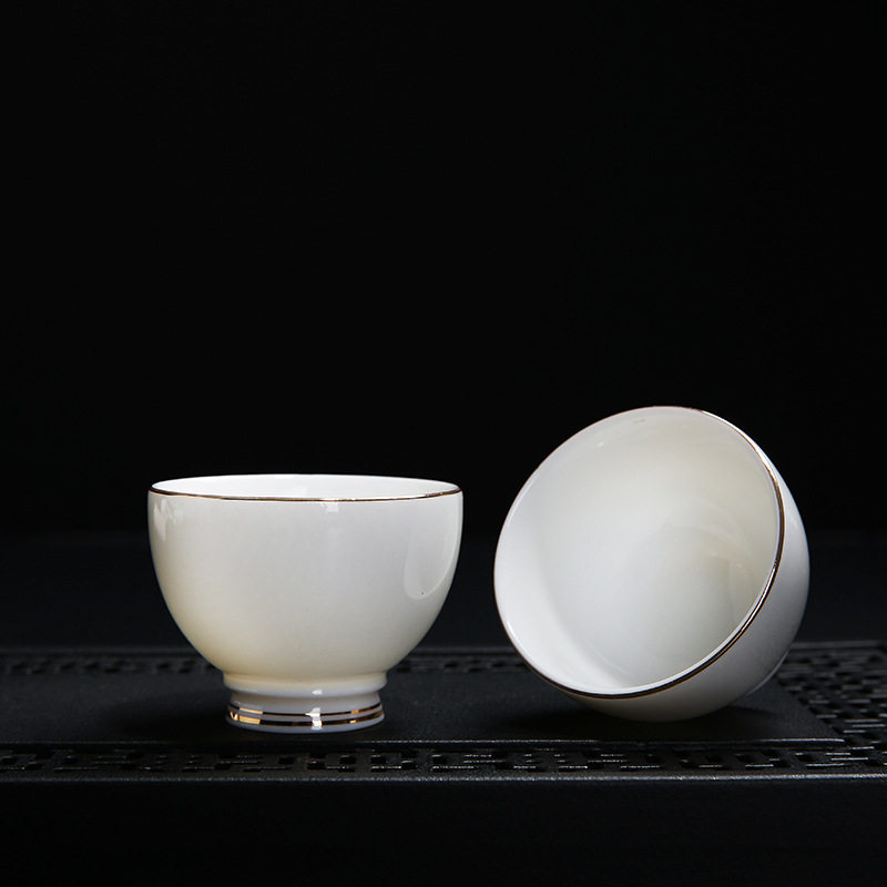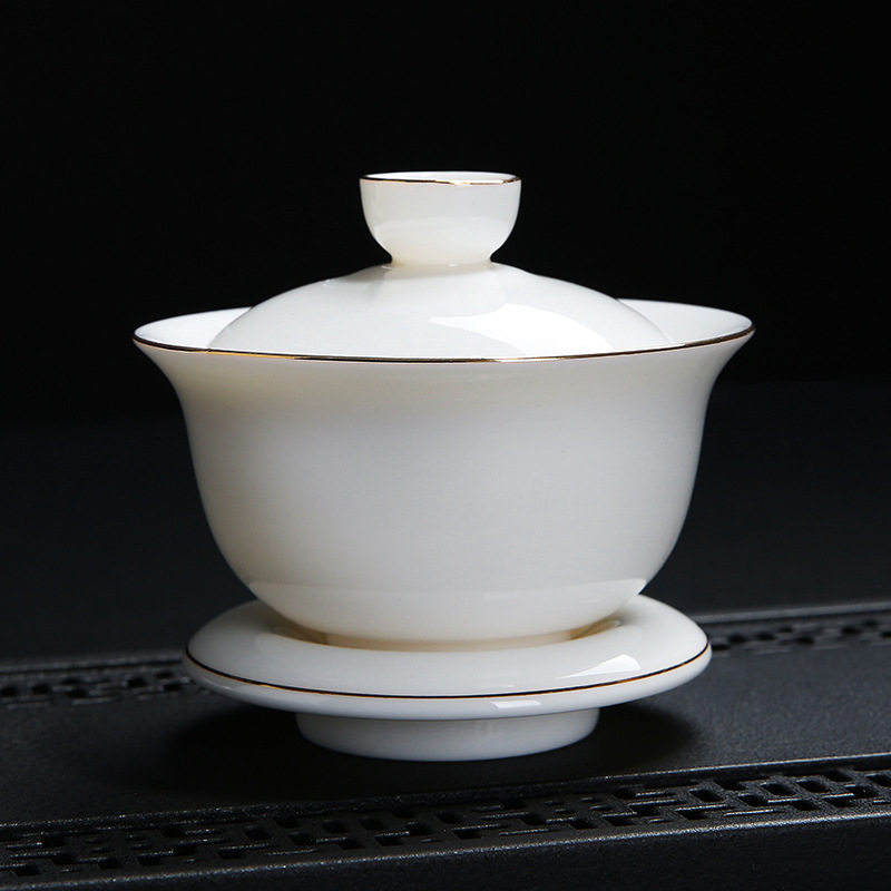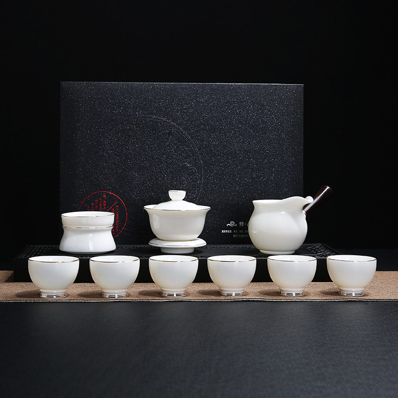 Van upper implements the whole set of high white jade porcelain kongfu tea furniture set with sketching gold and pork oil white three-only cover bowl ceramic tea cup