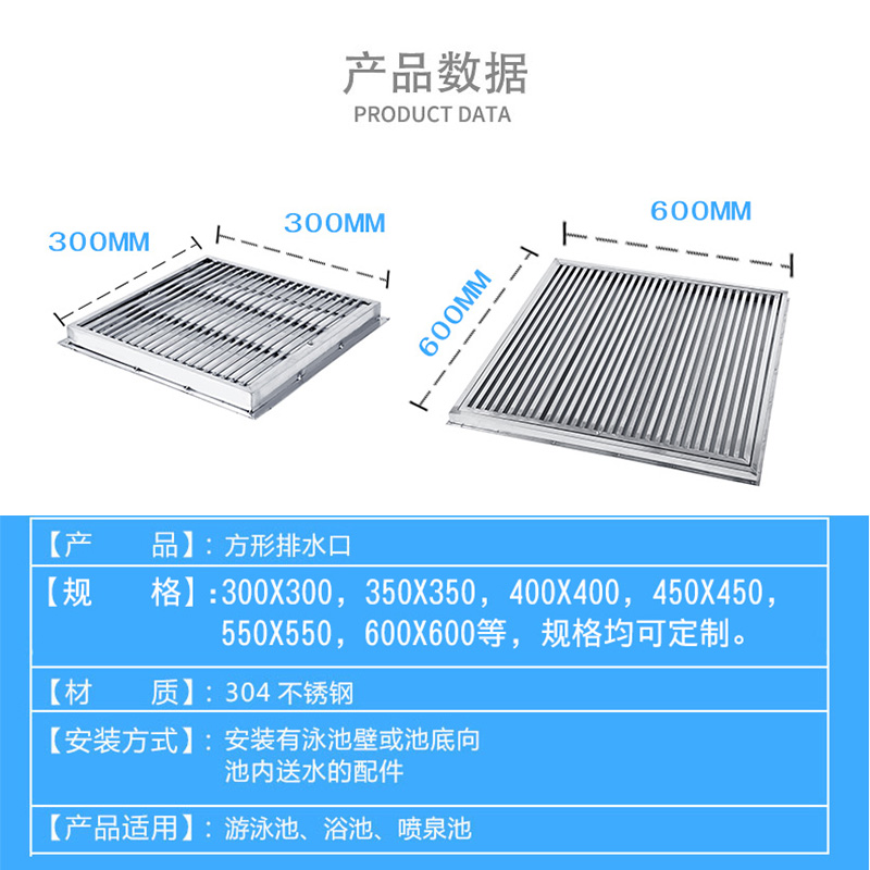 Swimming pool drainer square main drain outlet pool bottom outlet port 304 stainless steel square main drain overflow