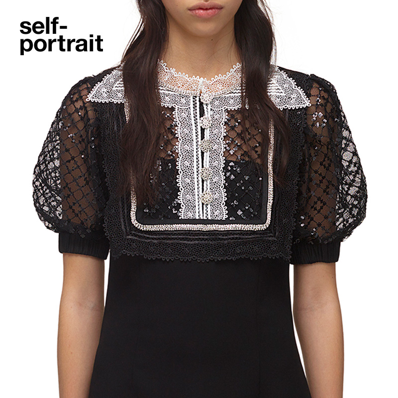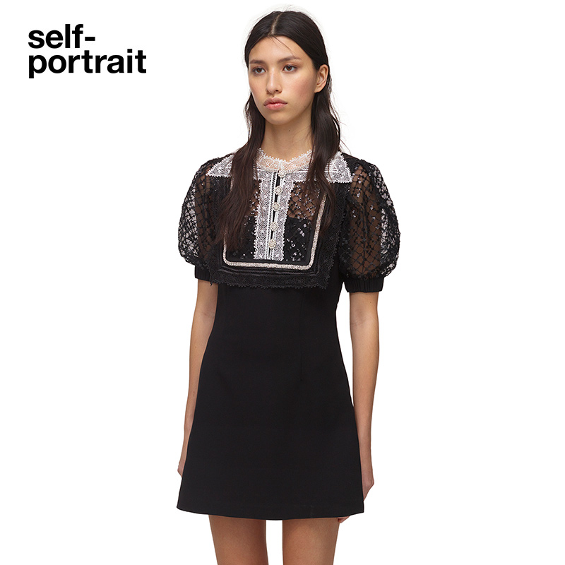 self-portrait 2021 Early autumn black and white grid sequins lace tulle dress Short skirt