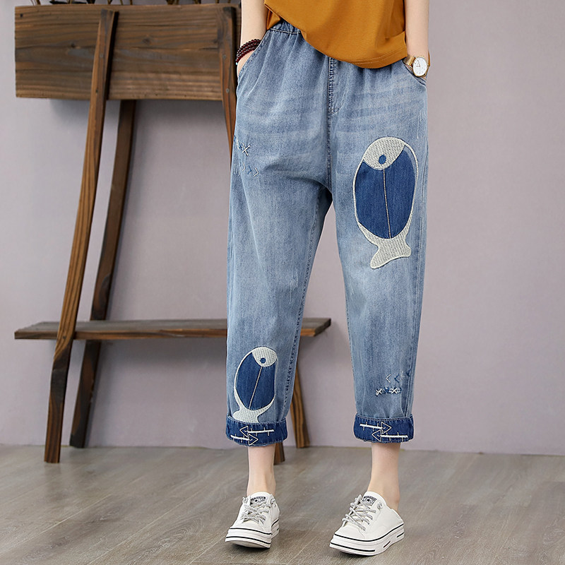 Hanso Yi Renaissance Embroidery Fish High Loose Seven-Minute Jeans Woman Summer Thin Harlem Trouser