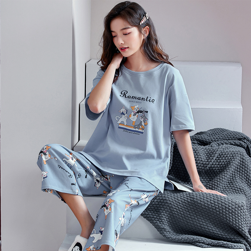 Gujin@Pajamas summer thin section short-sleeved cropped pants loose large size can be worn outside cotton home service ladies suit