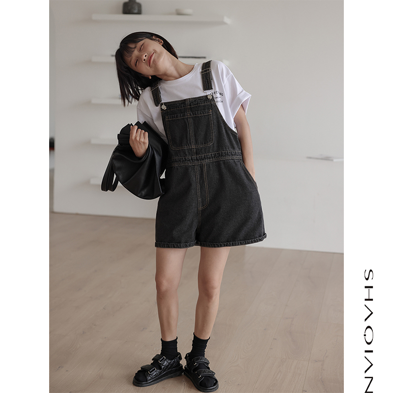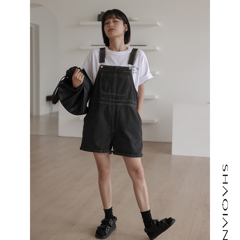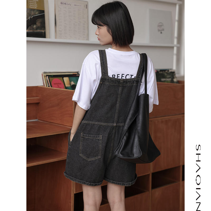 2022 new retro black net red denim baby bag pants women's wide-leg shorts summer loose thin jumpsuit tide