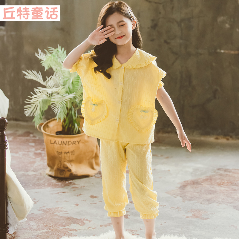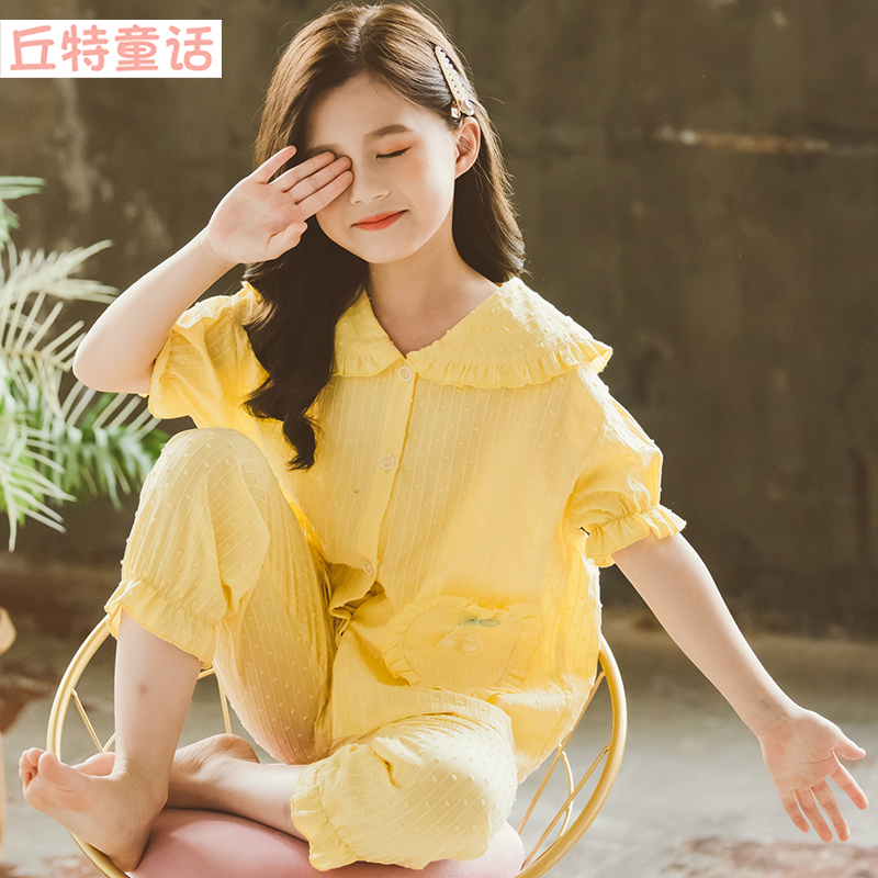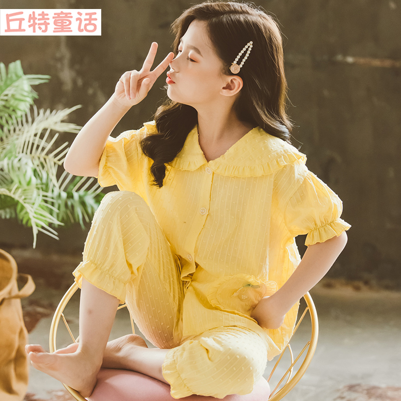 Girls summer pure cotton pajamas children's thin princess short-sleeved suit little girl baby air-conditioned home clothes cute
