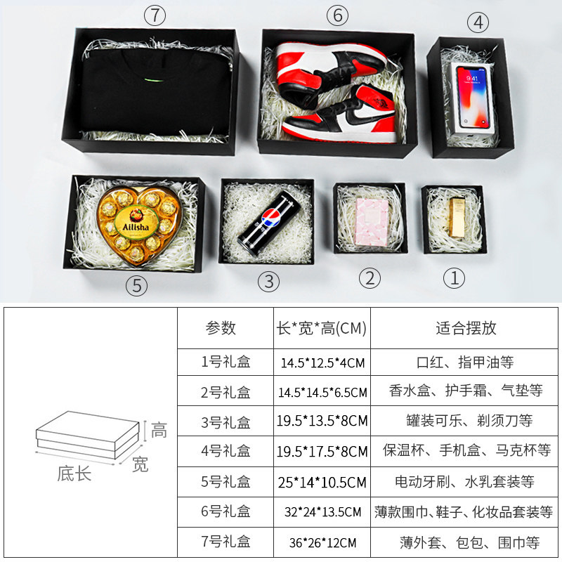 No. 1 (long 17 wide 13 meters high 6) (can fit 1-3 lipstick red) No. 3 (length 15 width 15 height 7) (can fit 30ml perfume air cushion lipstick) 5 (Long 20 Width 1)