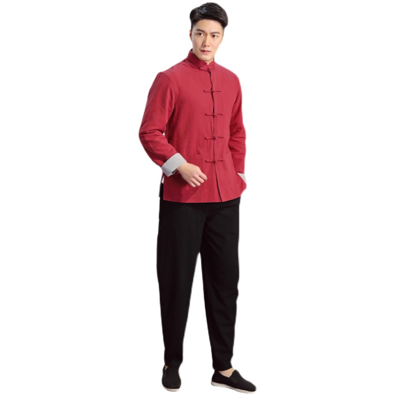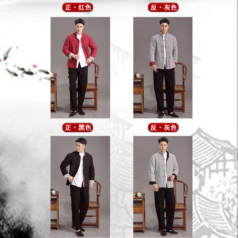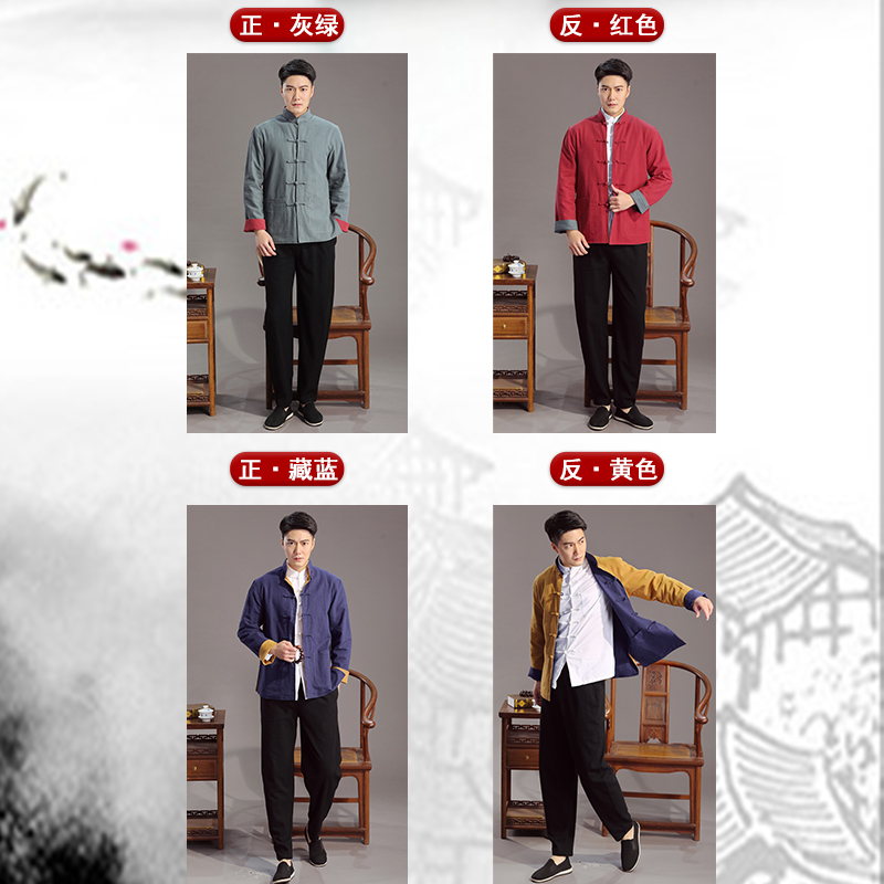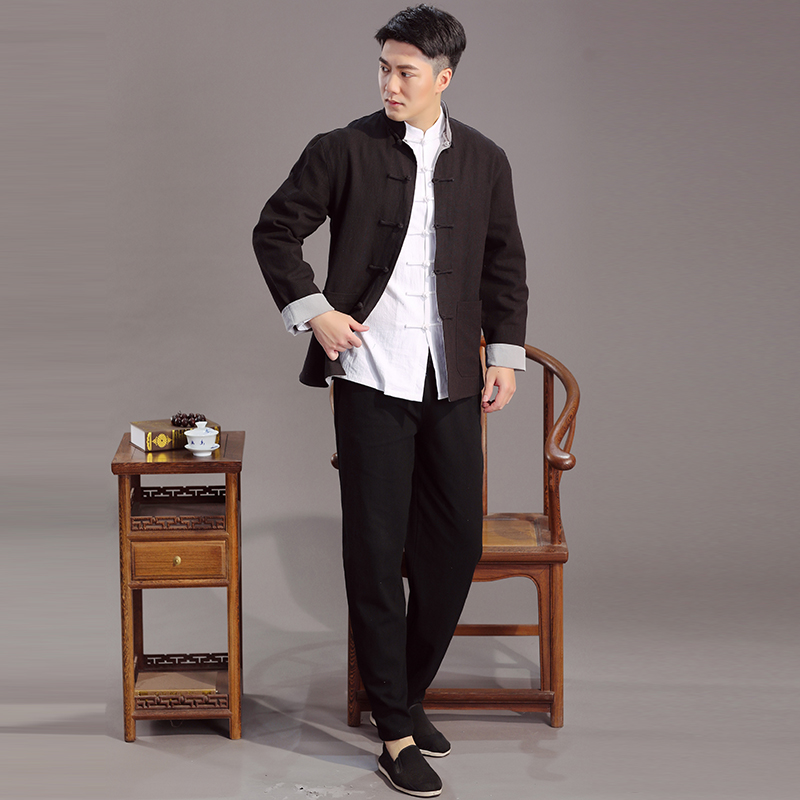 Spring and Autumn Tang suit men's burlap suit double-sided costumes long-sleeved Hanfu Chinese style stand collar jacket middle-aged and elderly father