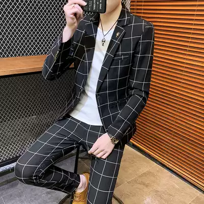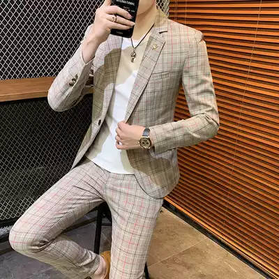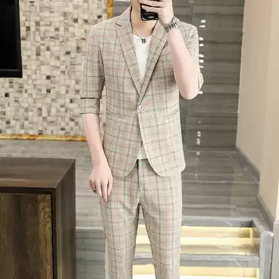 Summer men's suit suit thin casual plaid mid-sleeve small suit men's jacket Korean slim three-piece suit