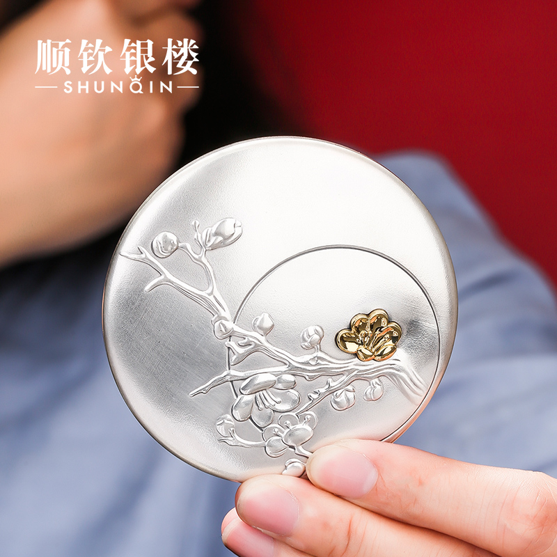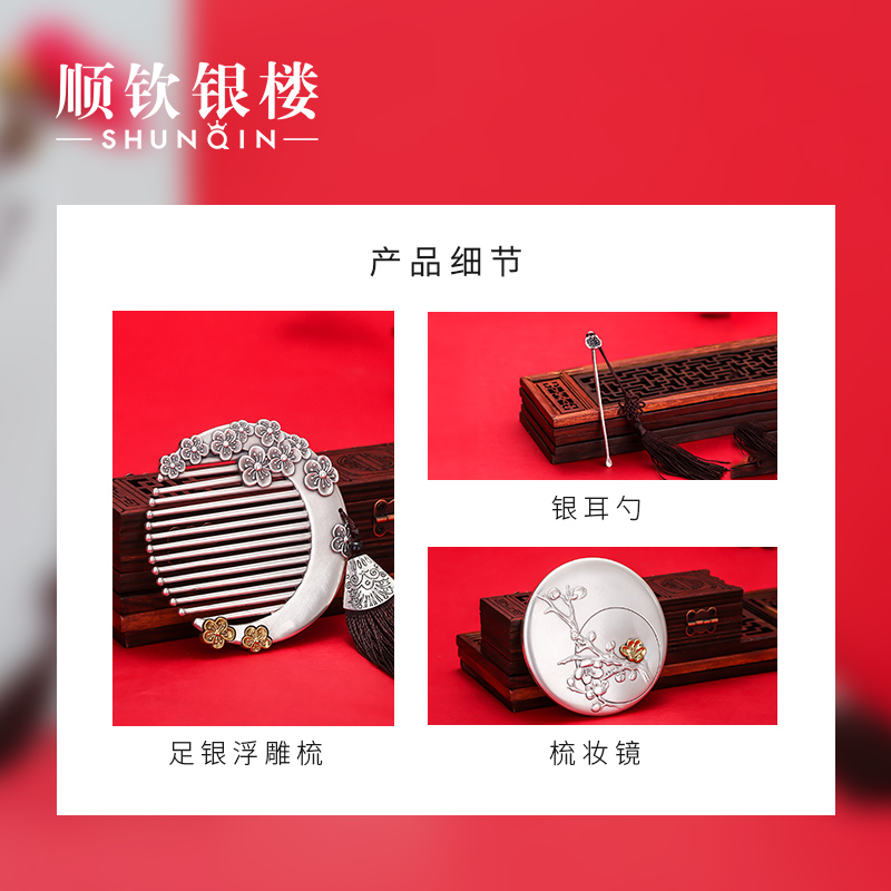 Shunqin Yinlou S999 sterling silver hair comb dream plum moon mirror ear scoop comb three-piece set to send friends wedding gifts