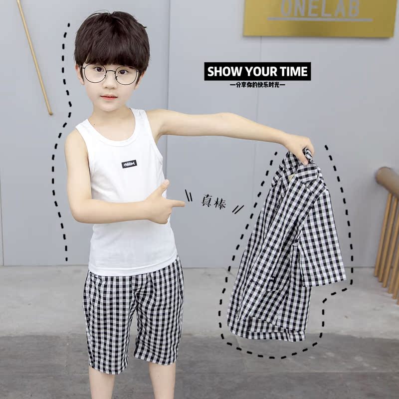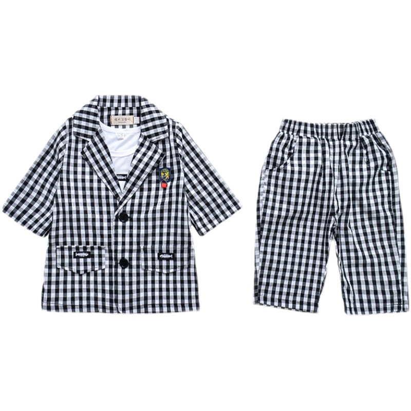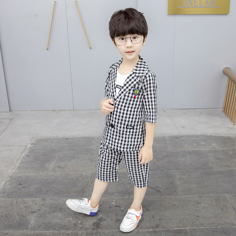 Boys suit summer British small suit casual short-sleeved boy plaid vest three-piece Korean dress suit