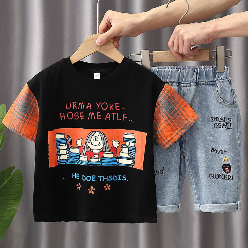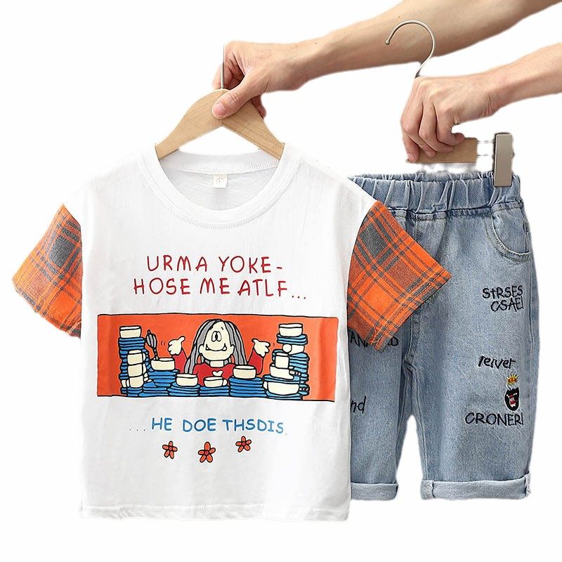 Boy Clothing Boy Pure Cotton T-shirt Two Sets 2021 Summer New Children's Korean Version Short Sleeve Suit Mid-Child Foreign Pie