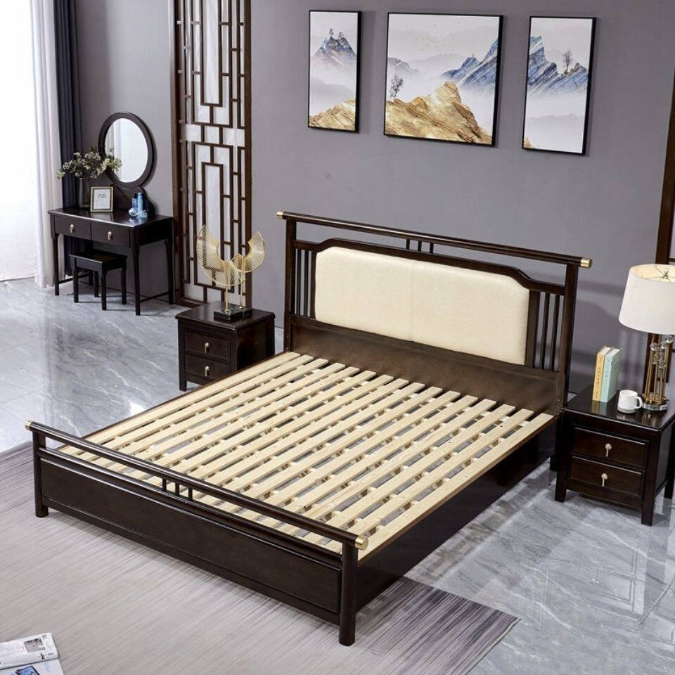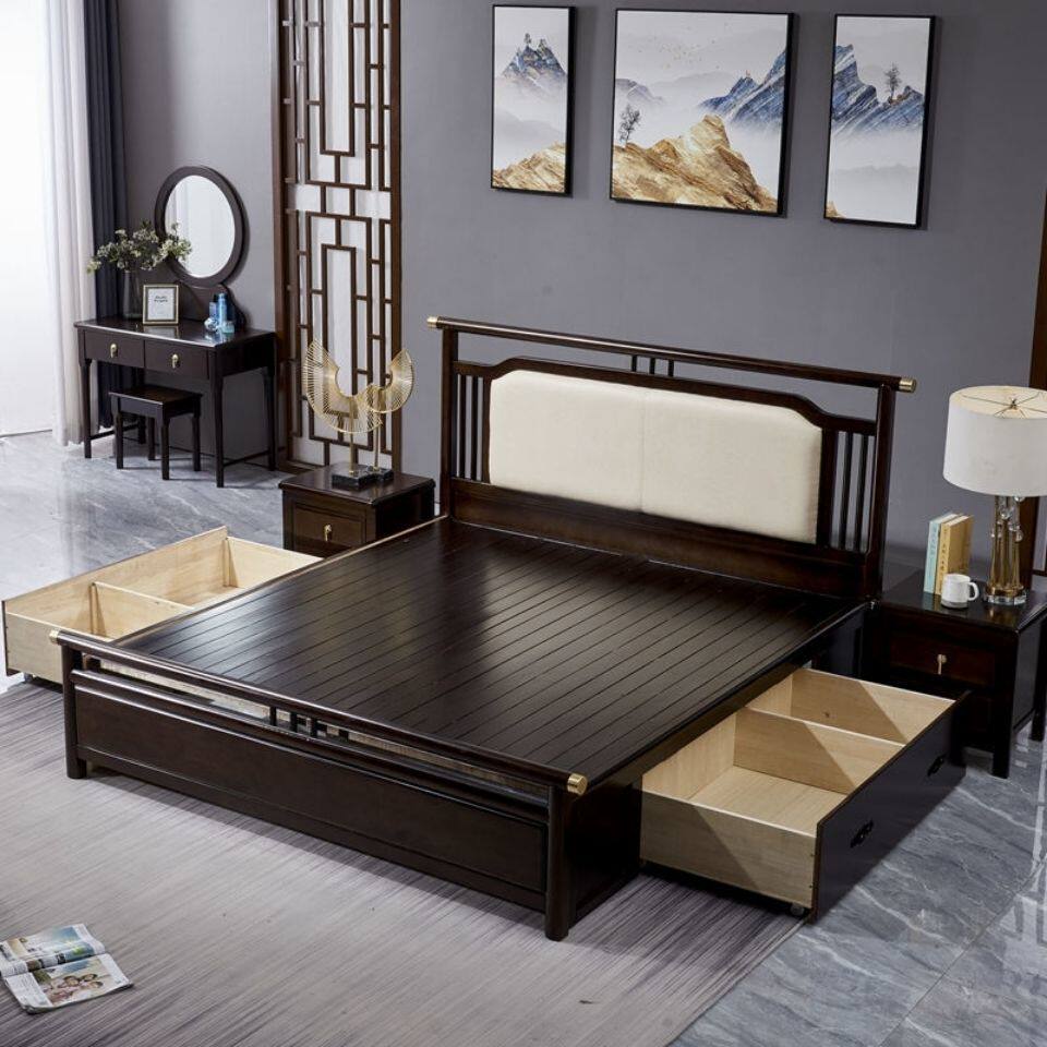New Chinese style solid wood bed storage master bedroom queen bed 1 8m double bed Zen light luxury 1 5m wedding bed bedroom furniture