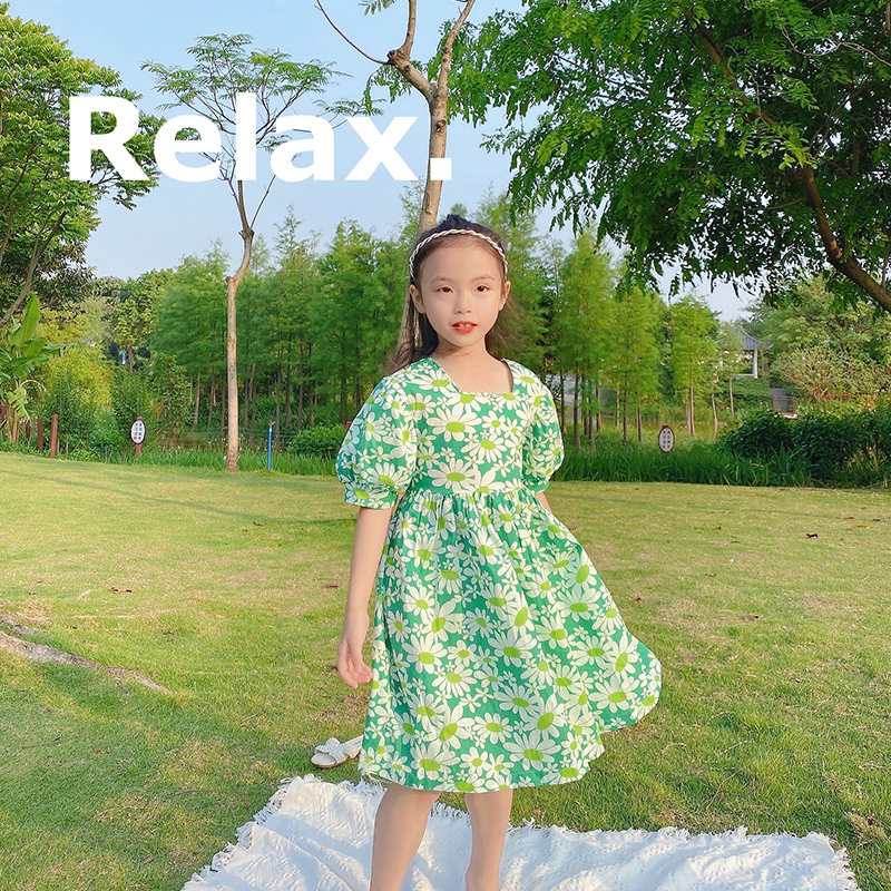 2022 summer girl's mother Korean version of the Korean version of the mother and women's clothing holiday windy side fashion chicks printed foreign dress