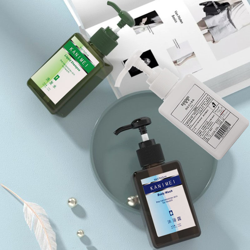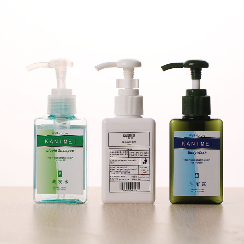 100ML square green with white background label, free buckle 100ML square white with shower gel label, free buckle 100ML square light powder with shampoo label, free buckle 1