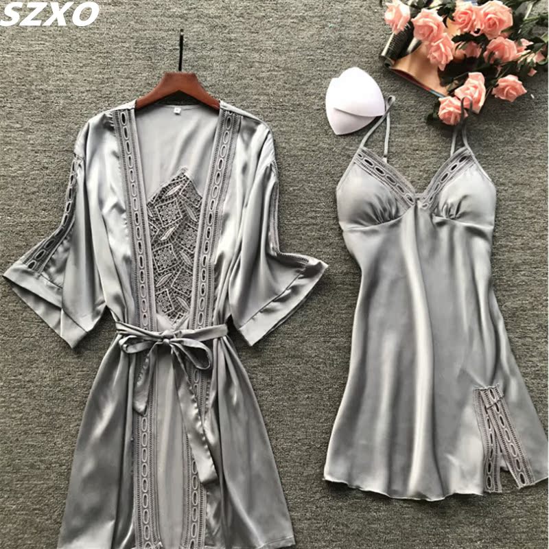 SZVA ice silk pajamas female spring autumn suspender nightgown with chest pad sexy thin luxury silk robe home wear