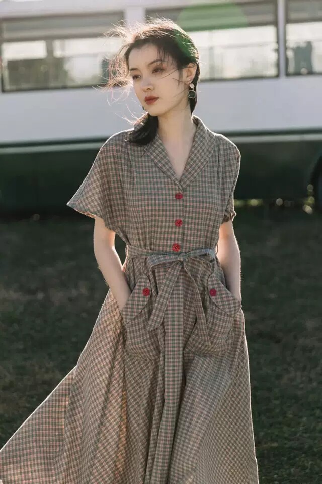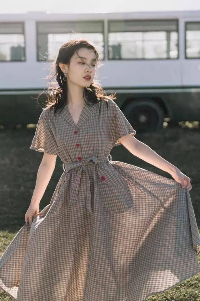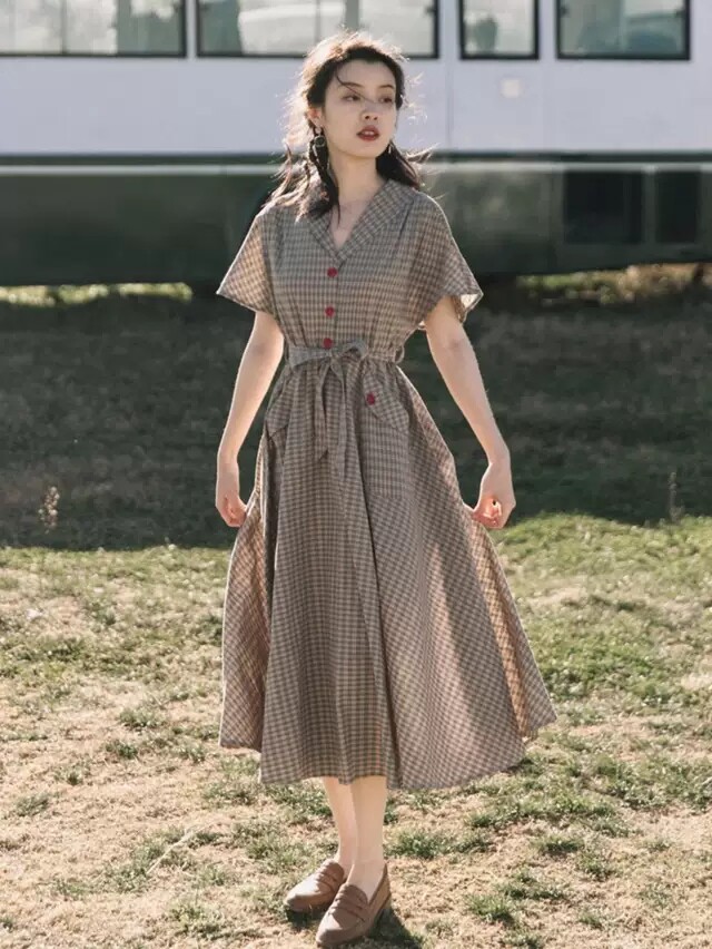 Sandro Monsl French style retro foreign dress Women 2022 Summer light cooked ethos Thin Plaid Long Dress