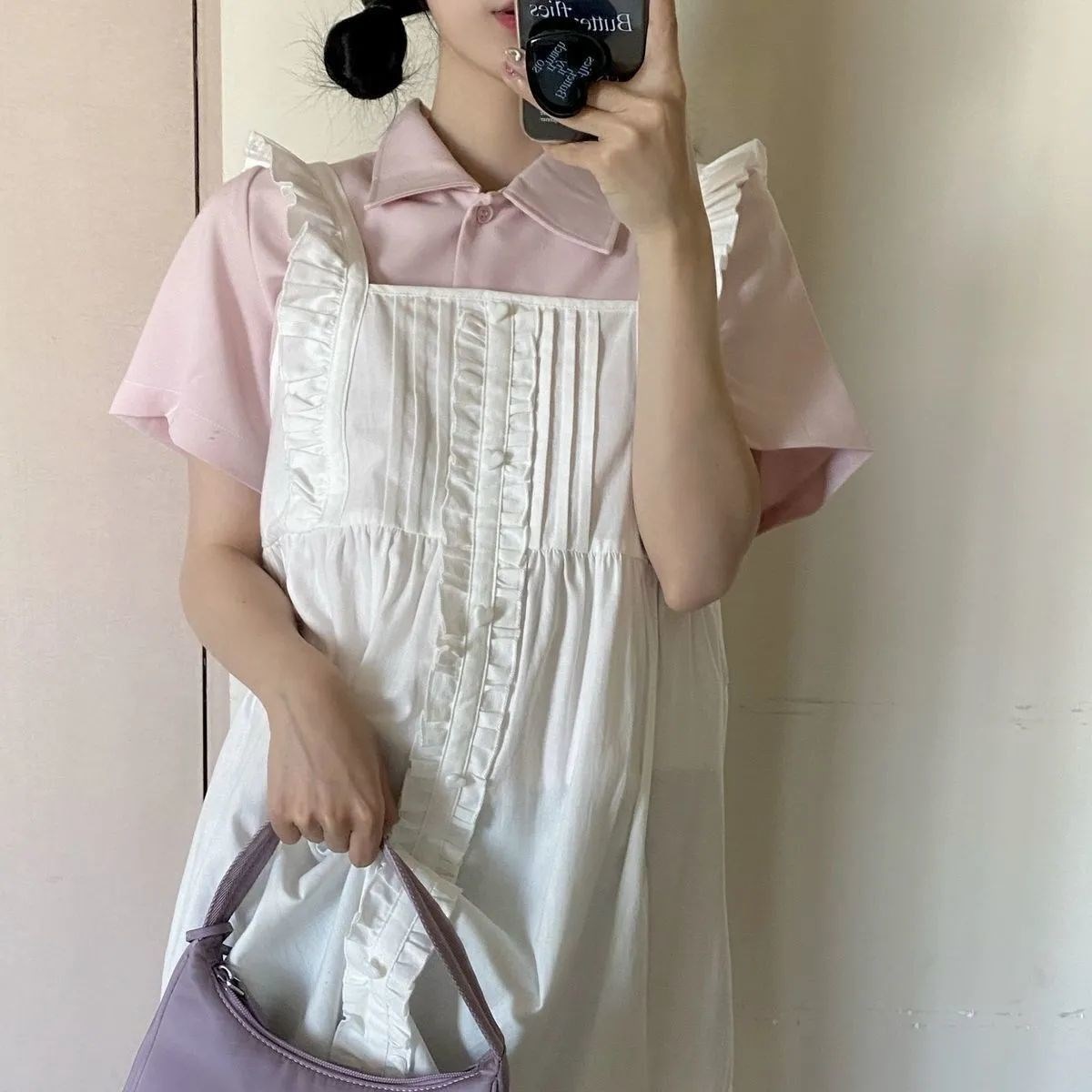 Summer suit female Japanese student loose folded lace baby bag dress pink shirt short-sleeved two-piece suit