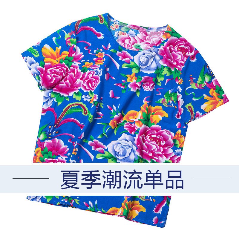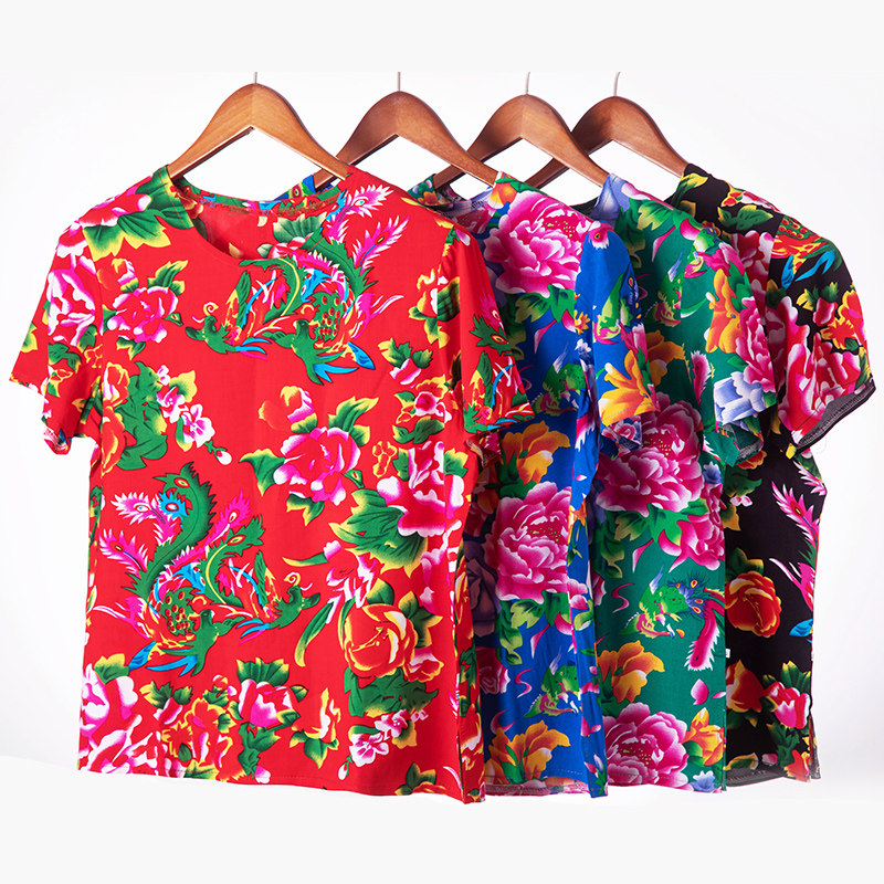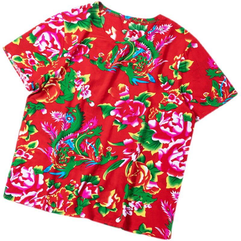 Northeast Great flower cloth short sleeve T-shirt clothes men and women ethnic wind blouses dance suit Two people turn to perform to shake-Taobao