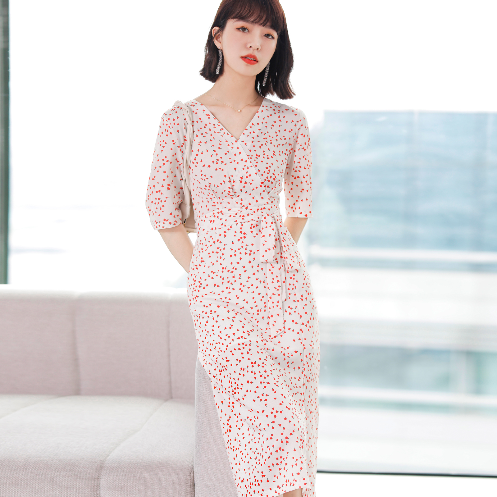 FENPERATE French style fresh cherry printed tea hysteria for summer new temperament V collar crushed floral dress