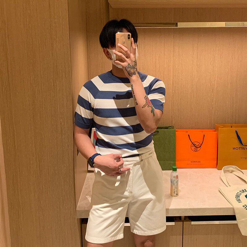 Ice silk short sleeves men summer new product 2022 popular stripe color block round neck T-shirt light cooked thin knitT shirt half sleeves