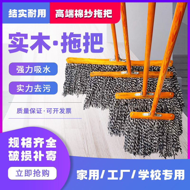 Large flat plate mop wooden rod cotton line old household pier fabric factory cotton yarn tile tow tow ordinary mop