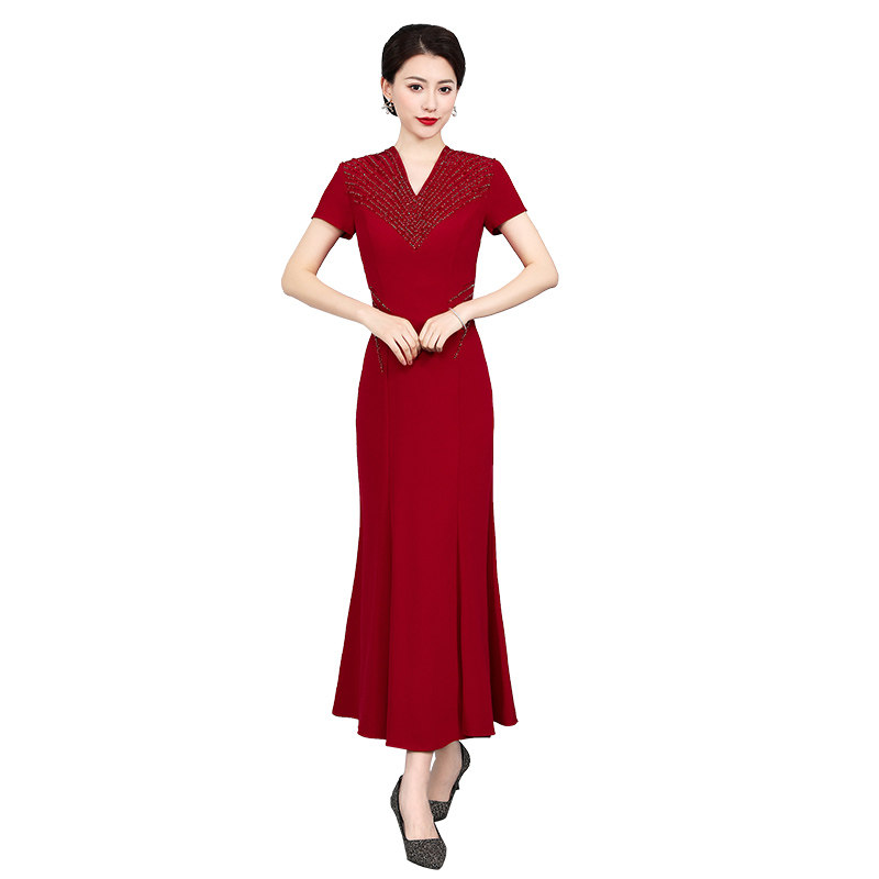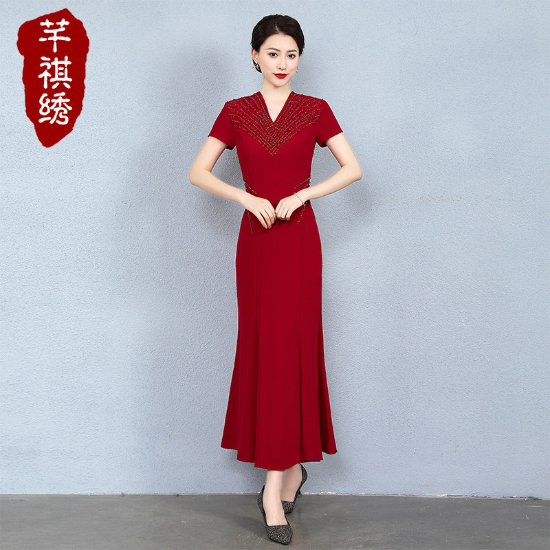 Young mother wedding long version modified acetate forged Cheongsam dress 2021 mother-in-law dress dinner dress noble