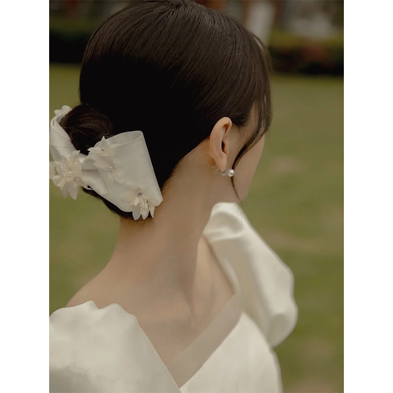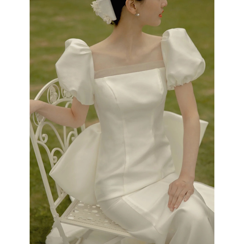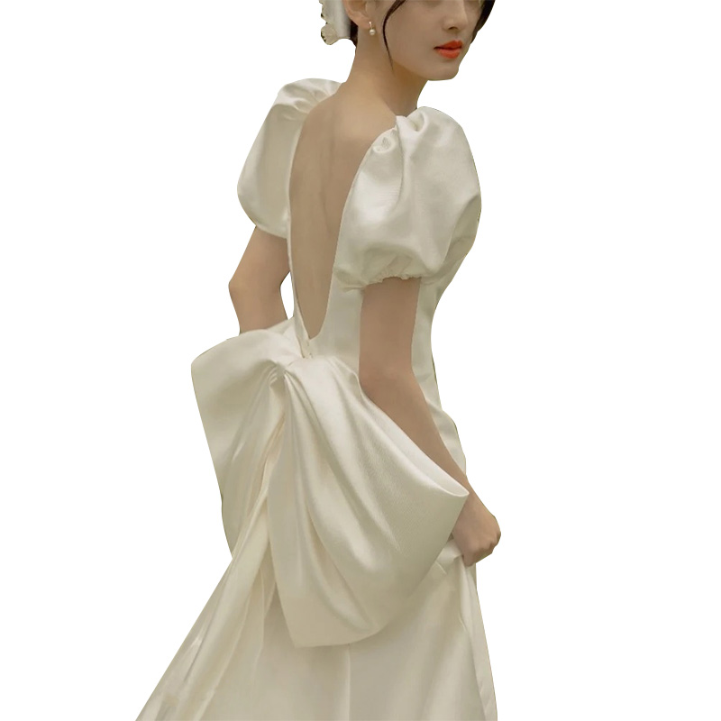 Halter bow wedding dress Bride wedding main yarn French Hepburn style Super Fairy Satin one-shoulder dress skirt welcome
