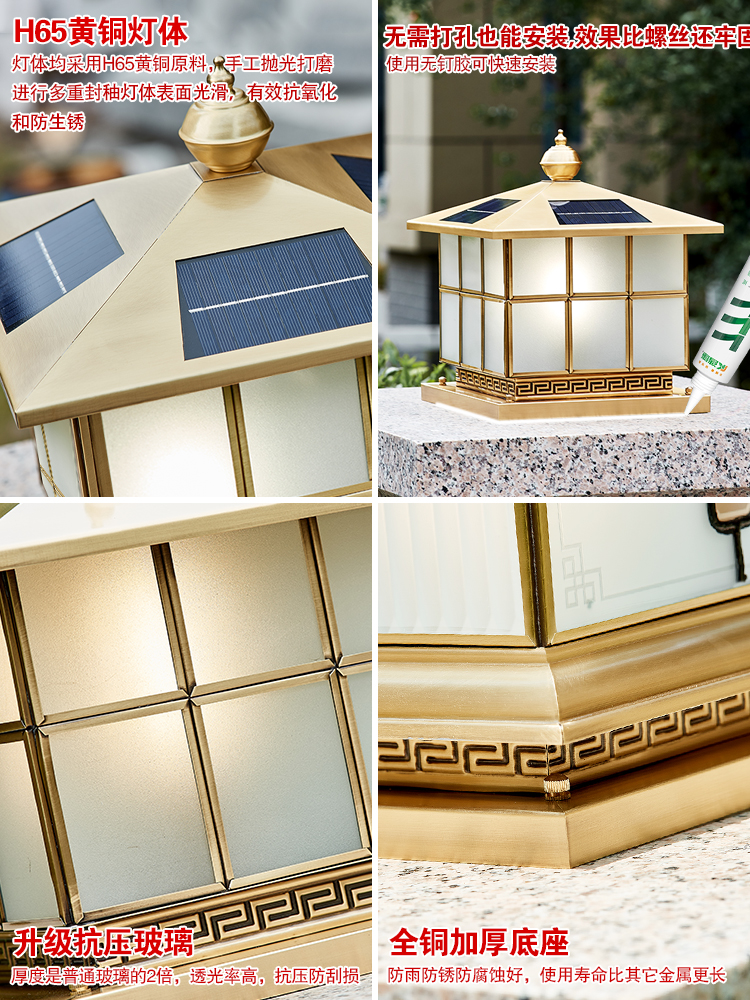 All-copper solar column head lamp outdoor waterproof fence gate pillar lamp outdoor villa wall head led garden lamp