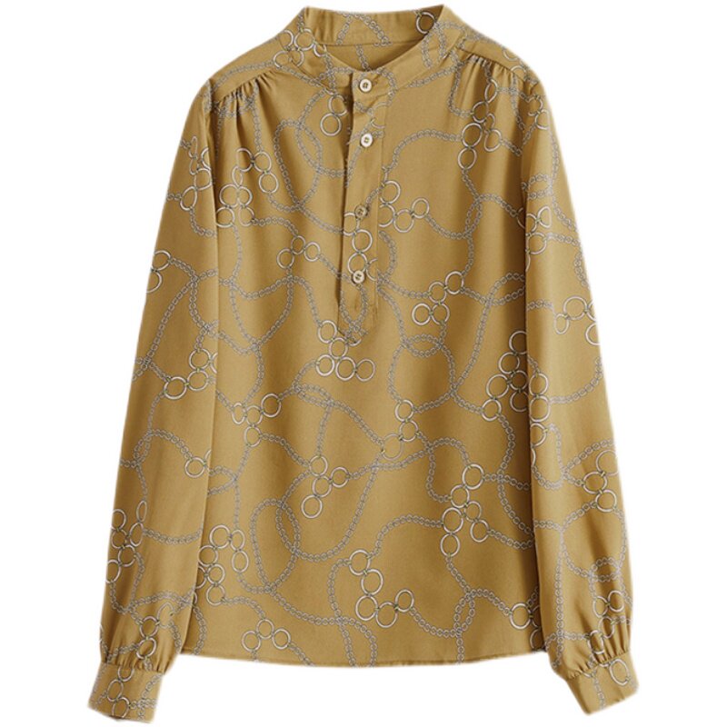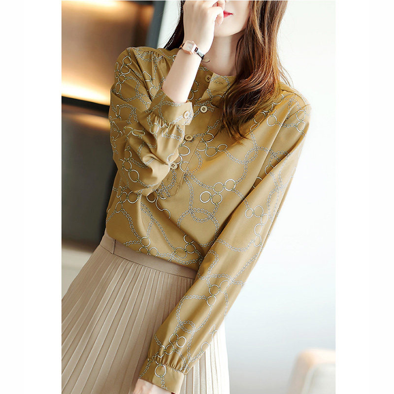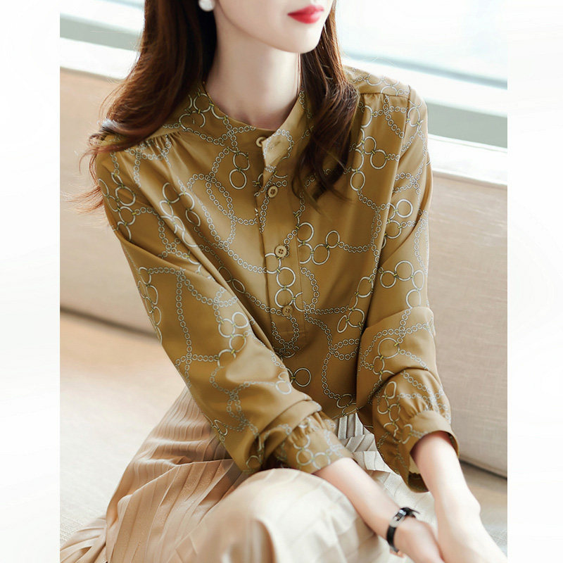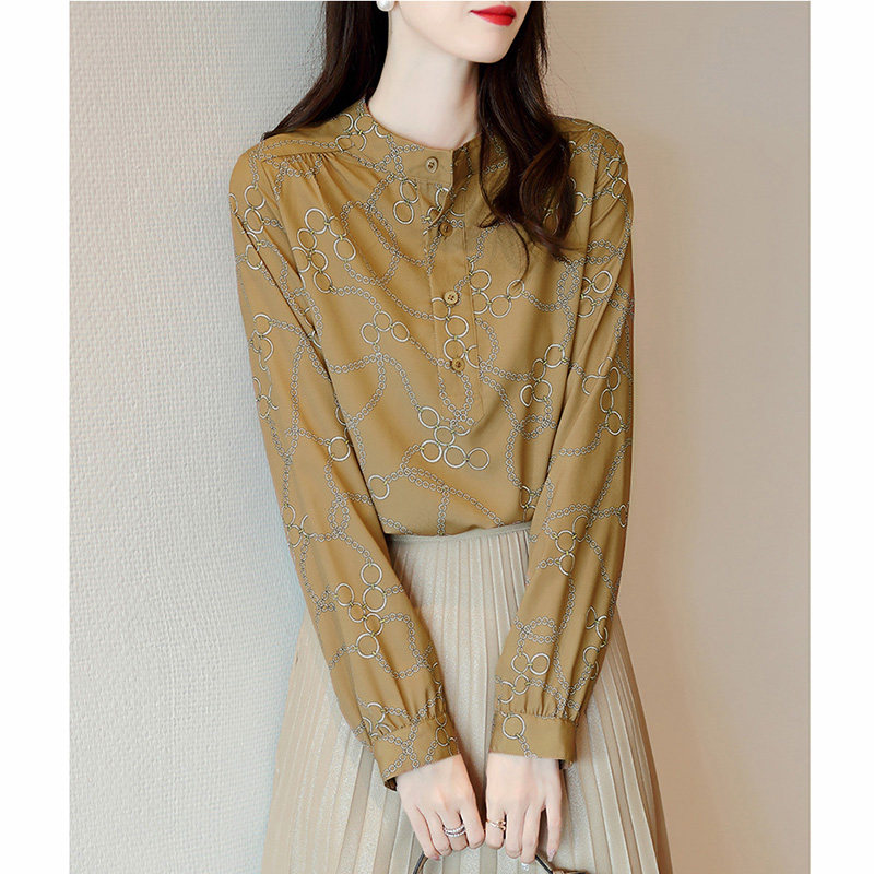 Mularsa Khaki long sleeve chiffon shirt women's 2021 new French stand-up collar top Western style in-line shirt