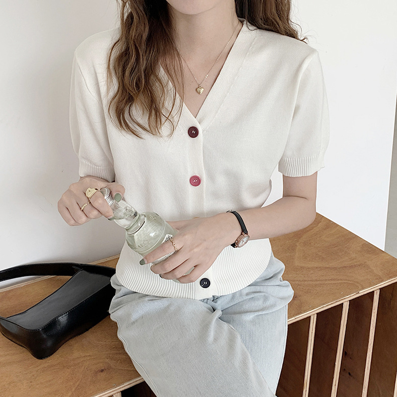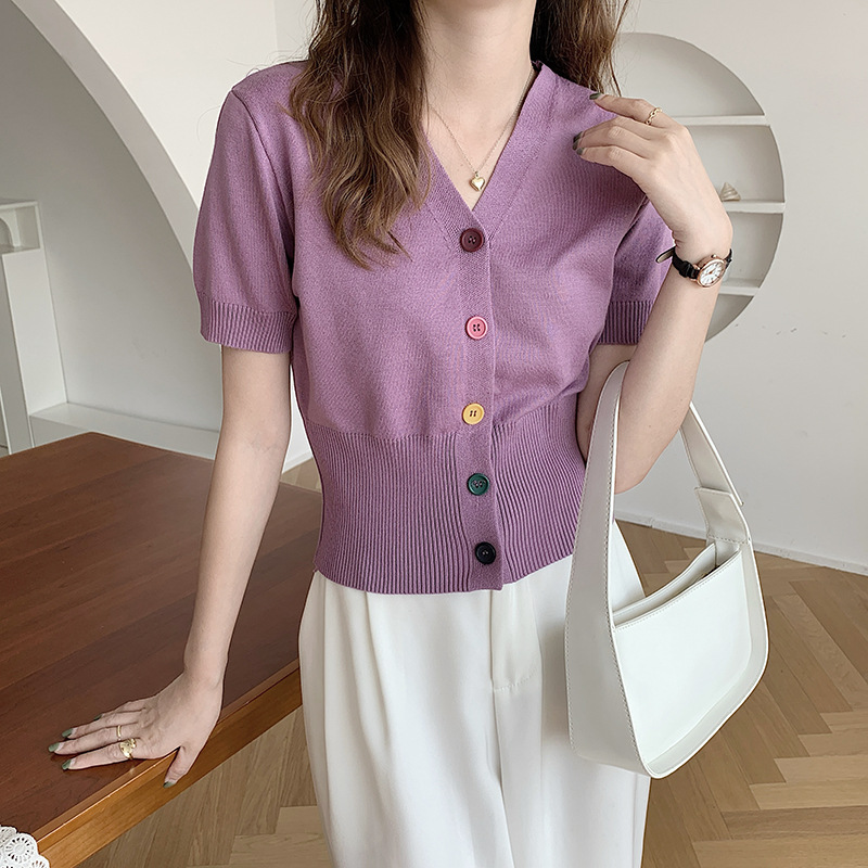 Short sleeve t-shirt woman design feeling small crowd short cut blouses jacket waist display slim and thin ice wire weasel-shirt V collar cardigan