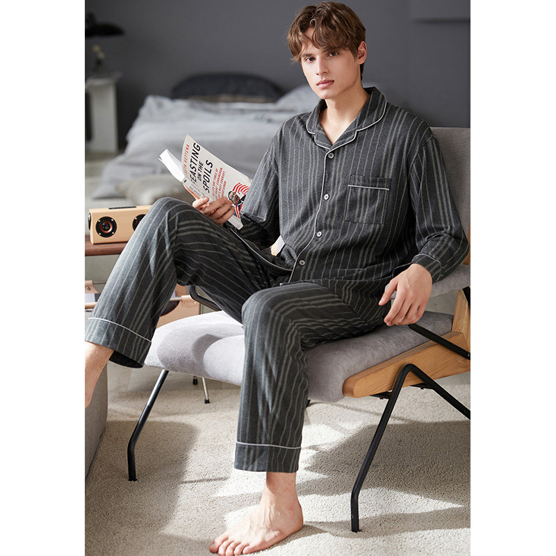 Tang Shi 2022 Summer New Nightwear Men's Comfort Housewear Full Cotton Stripe Long Sleeves Long Sleeves Long Pants Loose Suit Instagram