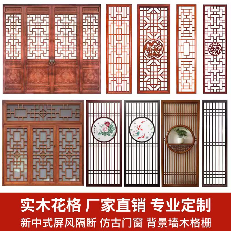 Dongyang wood carving solid wood lattice hollow new Chinese style screen partition living room background wall decoration antique doors and windows custom-made