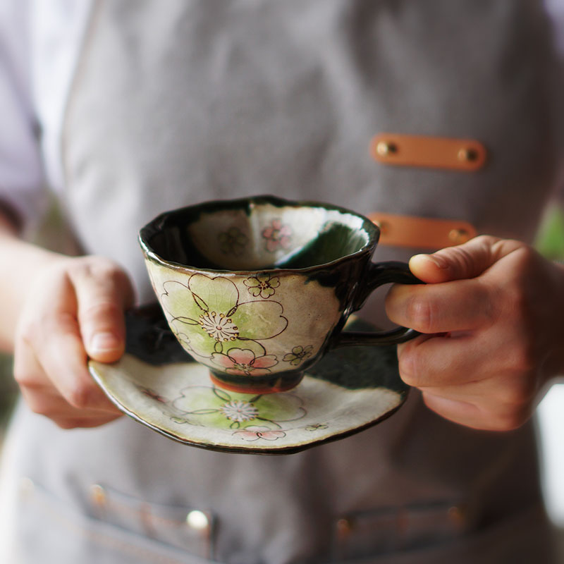 Li Tai's home Japan imported weaving hand-made clay cup and saucer set retro green cherry coffee cup afternoon tea cup