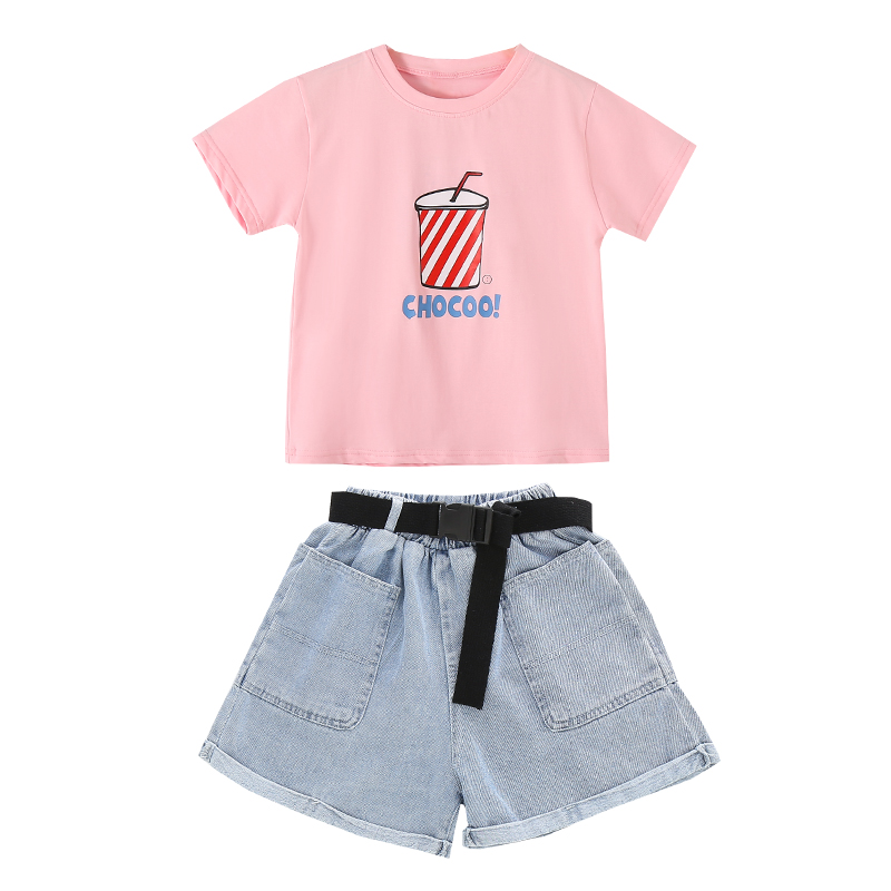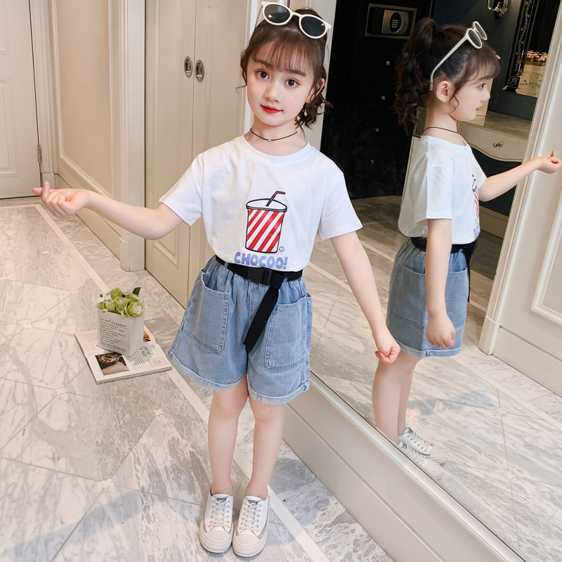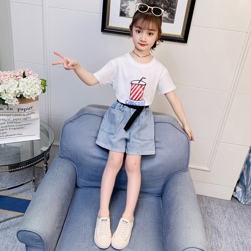 Girl Suit 2021 Summer Dress New Children Foreign Korea Edition Pure Cotton Denim Shorts Little Girl Summer Two Sets
