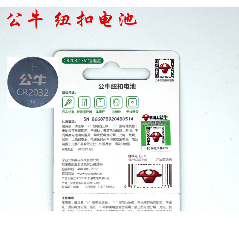 Bull button battery CR 2032 car key car key battery remote control 3v lithium battery electronic Gelli Dihao