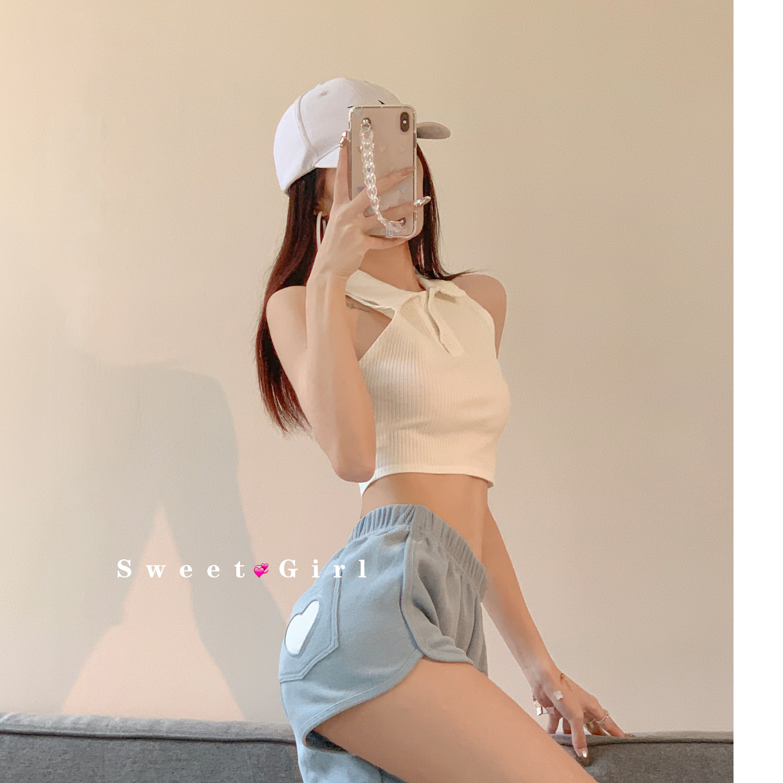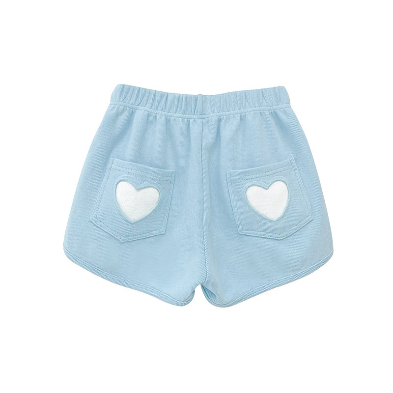 Girly feeling hole love cloth sticker sports shorts gentle wind autumn loose casual pants elastic waist wide leg hot pants