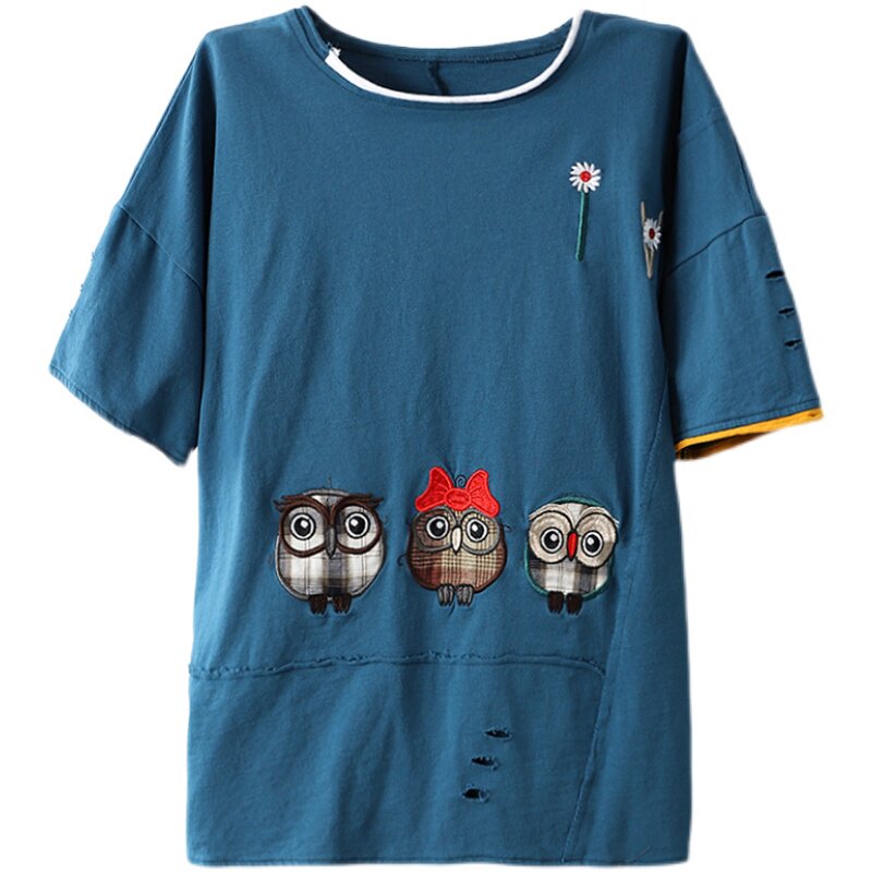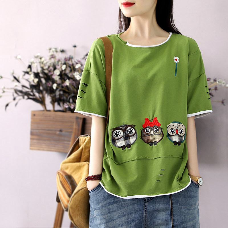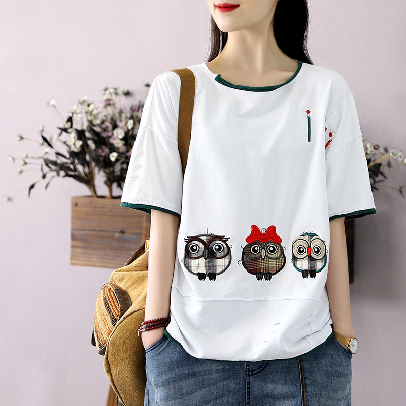 Han Suoyi retro literature and art summer women's loose lazy top patch embroidered owl t-shirt women's short-sleeved national tide